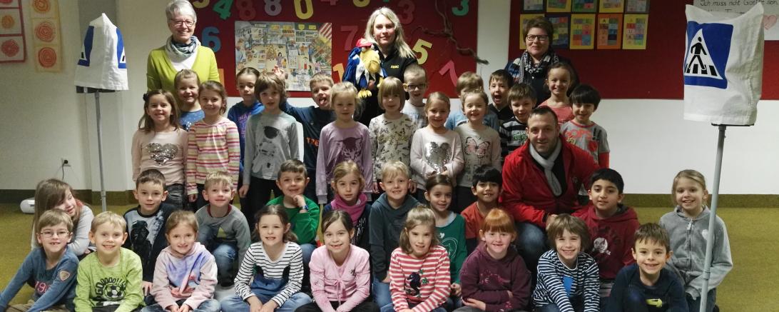 Im praktischen Teil werden die Kinder mit dem Verkehrsablauf an Fußgängerampeln und -überwegen vertraut gemacht. Dort wurde das richtige Verhalten aktiv eingeübt. Dabei spielten die Kinder abwechselnd die Fußgänger und andere Verkehrsteilnehmer wie z.B. Autofahrer. Besonders die wichtige Interaktion durch den Blickkontakt zwischen Fußgänger und Autofahrer wurde mehrfach geübt und so von den Kindern verinnerlicht. Zum Schluss verteilte Frau Mair zusammen mit dem ADACUS an die Kinder einen Aufkleber, der sie immer an diese Stunde erinnern soll. Spielberger bedankte sich beim ADACUS sowie bei der Moderatorin für die hervorragende Präsentation.