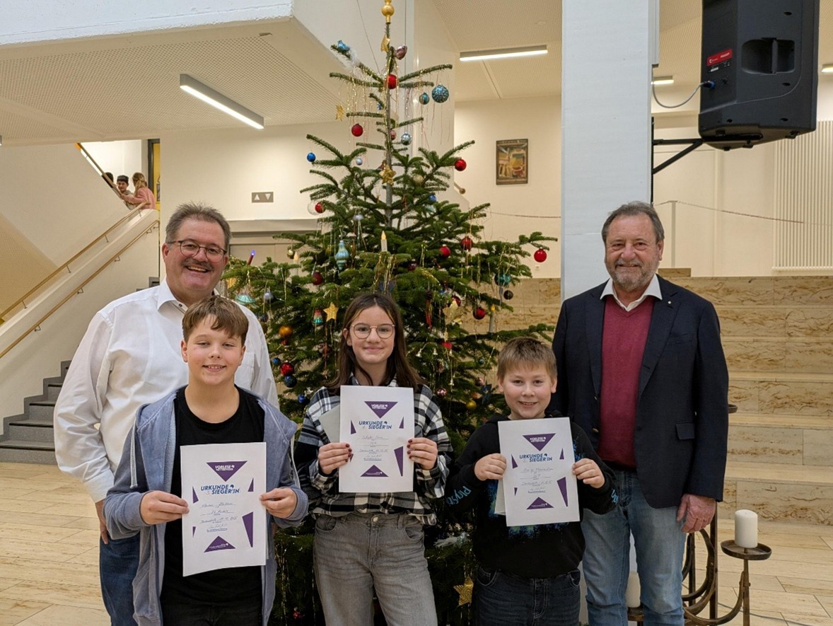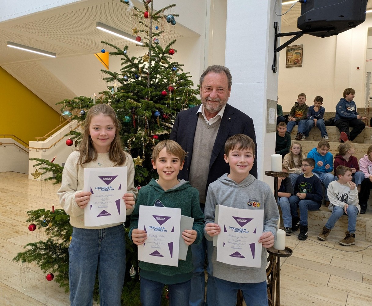Die Leistungen waren durchweg beeindruckend, doch eine der Vorleserinnen stach besonders hervor: Lukas Roßkopf (Klasse 5b) und Sina Schoder aus der Klasse 6c, deren fesselnde Darbietung und natürliche Erzählweise das Publikum und die Jury, bestehend aus den Deutschlehrkräften des Jahrgangs, gleichermaßen beeindruckten. Lukas und Sina wurden durch unseren Schulleiter Wolfgang Mühldorfer zur verdienten Siegerin des Wettbewerbs gekürt und erhielt großen Applaus von Mitschülern und Lehrern. Auf den Plätzen folgten Magdalena Leinfelder (5a) und Raphael Reichensperger (5c) sowie Maximilian Burger (6c) und Felix Blattner (6d).