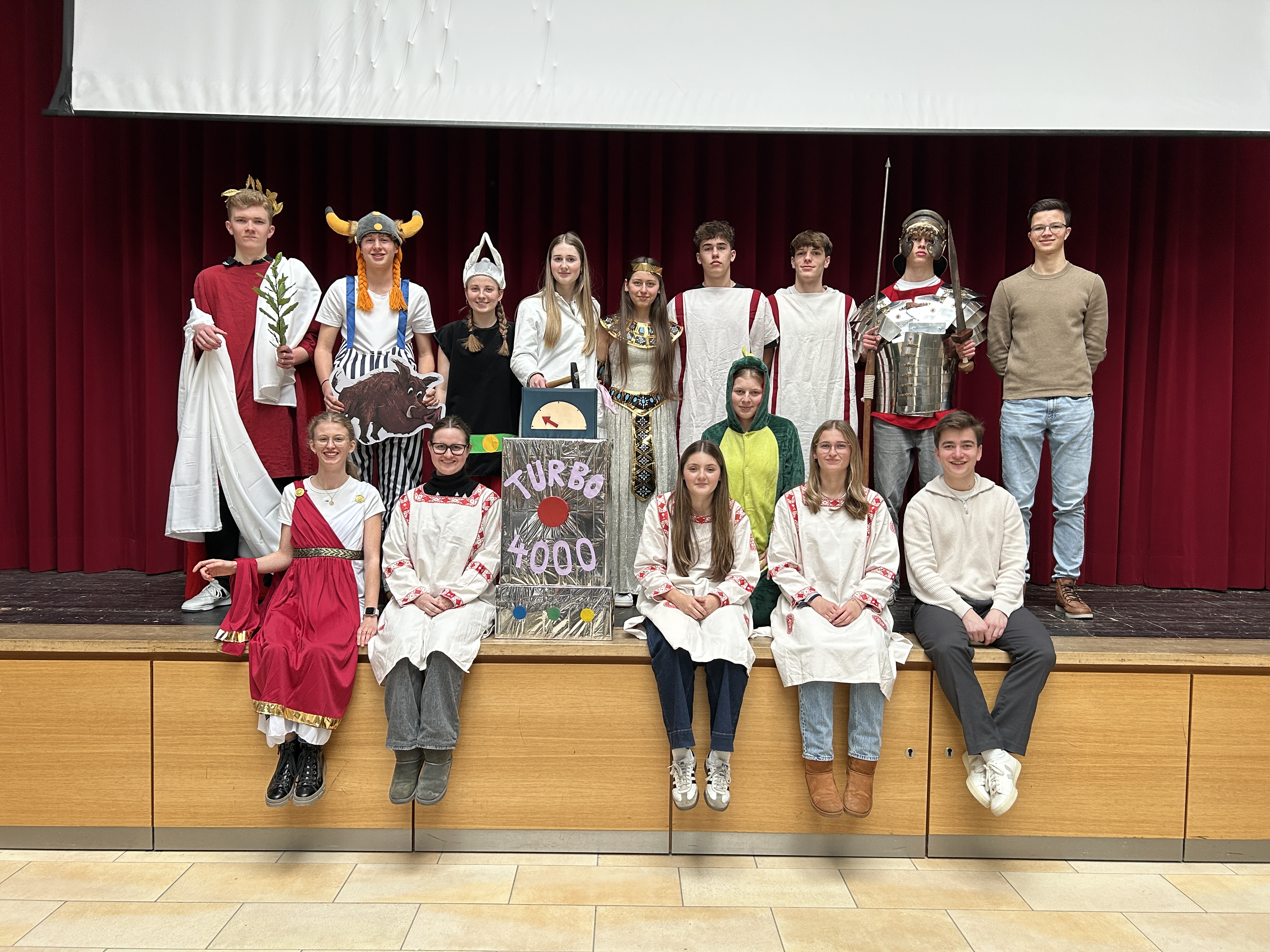 OStD Manuel Streubert übernahm die Begrüßung und freute sich vor allem, dass in diesem Jahr wieder Viertklässler aus der Parkstadt, Riedlingen und Oberndorf zusammen mit ihren Lehrern teilnahmen.  Den Auftakt in der Aula bestritten die Schüler des P-Seminars „Römertag“ unter der Leitung von Elisabeth Hroß. Sie hatten ein humorvolles kleines Theaterstück vorbereitet, bei dem es mit Hilfe einer Zeitmaschine zurück ins alte Rom ging. Dabei traten so bekannte Persönlichkeiten wie Cäsar, Asterix und Kleopatra auf.