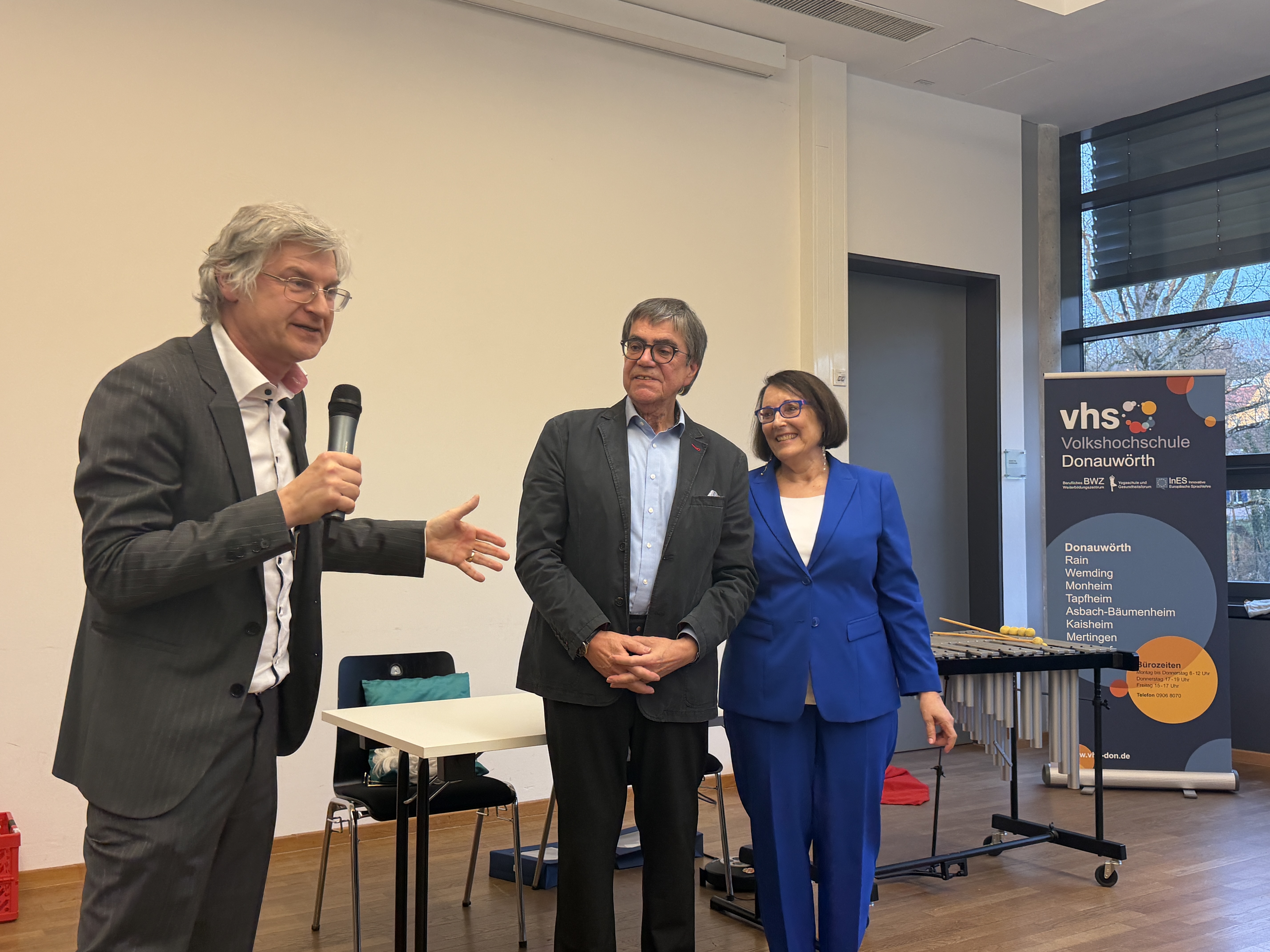 Auch der ehemalige Bürgermeister der Stadt Donauwörth, Jörg Fischer, verabschiedete das bisherige Führungsduo. „Gudrun Reißer trat mit dem Ziel an, die jahrzehntelange Arbeit zu erhalten und stets neues zu finden. Unterstützung fand Sie bei Paul Soldner, der eigene Ideen einbrachte und mit eigenen Vorträgen das Wirken der VHS ganz persönlich verinnerlichte. Gemeinsam haben wir gerade in der Flüchtlingskrise viel gemeinsam geleistet. Und mit dem Demokratieführerschein haben wir ein ganz wichtiges Projekt geschaffen.“ Fischer lobte die Bildung als Basis einer sozialen, humanen und engagierten Bevölkerung. „Danke für dieses Engagement, dass Sie mit viel Herzblut geleistet haben.“