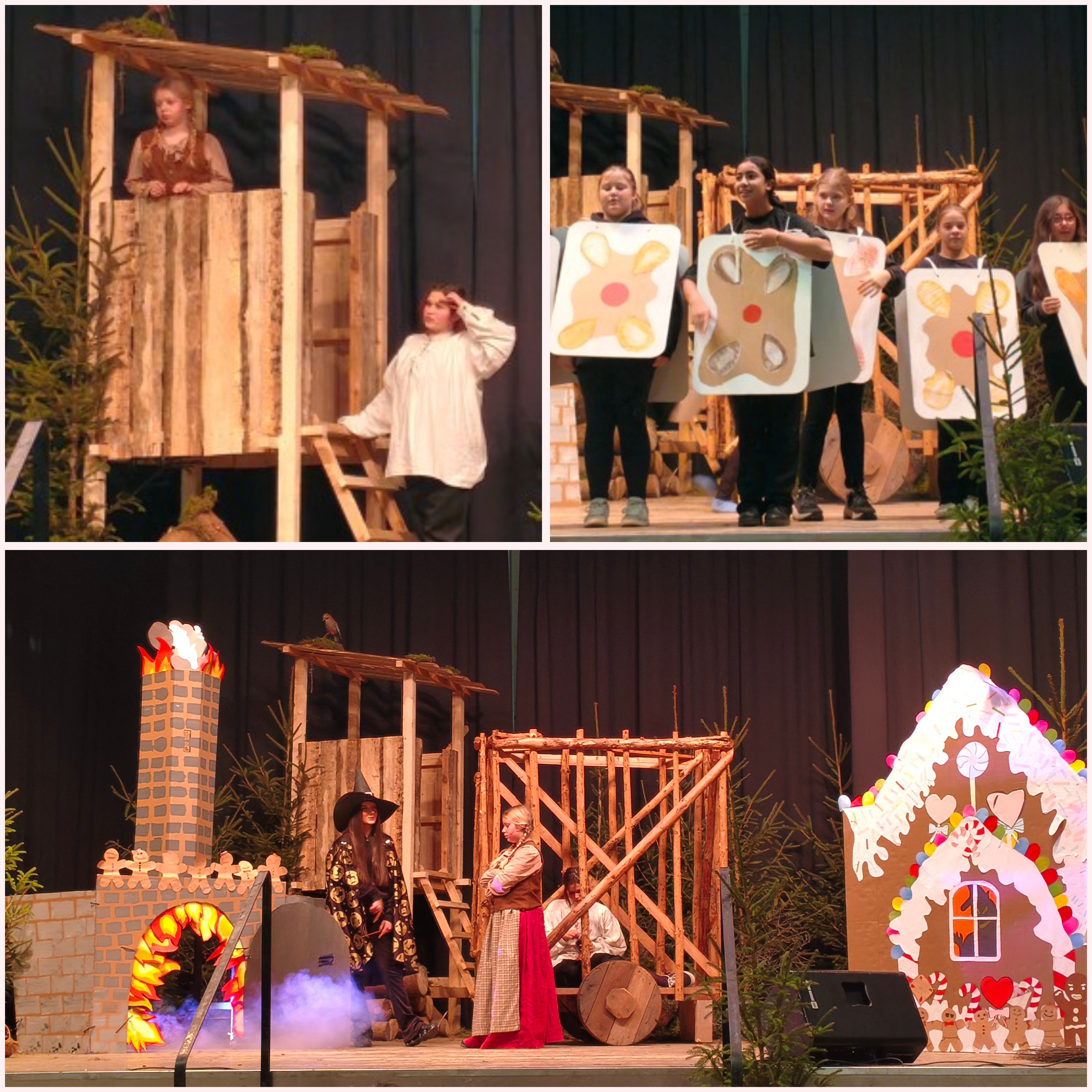 Besonders hervorzuheben war das liebevoll gestaltete Bühnenbild. Mit großer Leidenschaft entstanden Kulissen und Requisiten, die das Schulhaus zuvor zeitweise in ein märchenhaftes Lebkuchenhaus verwandelten – auch wenn die zahlreichen Lebkuchen am Ende „leider“ nur aus Pappe bestanden. Die kreative Umsetzung zeigte eindrucksvoll, wie viel Fantasie und handwerkliches Geschick in der Schulgemeinschaft und der engagierten Elternschaft stecken.