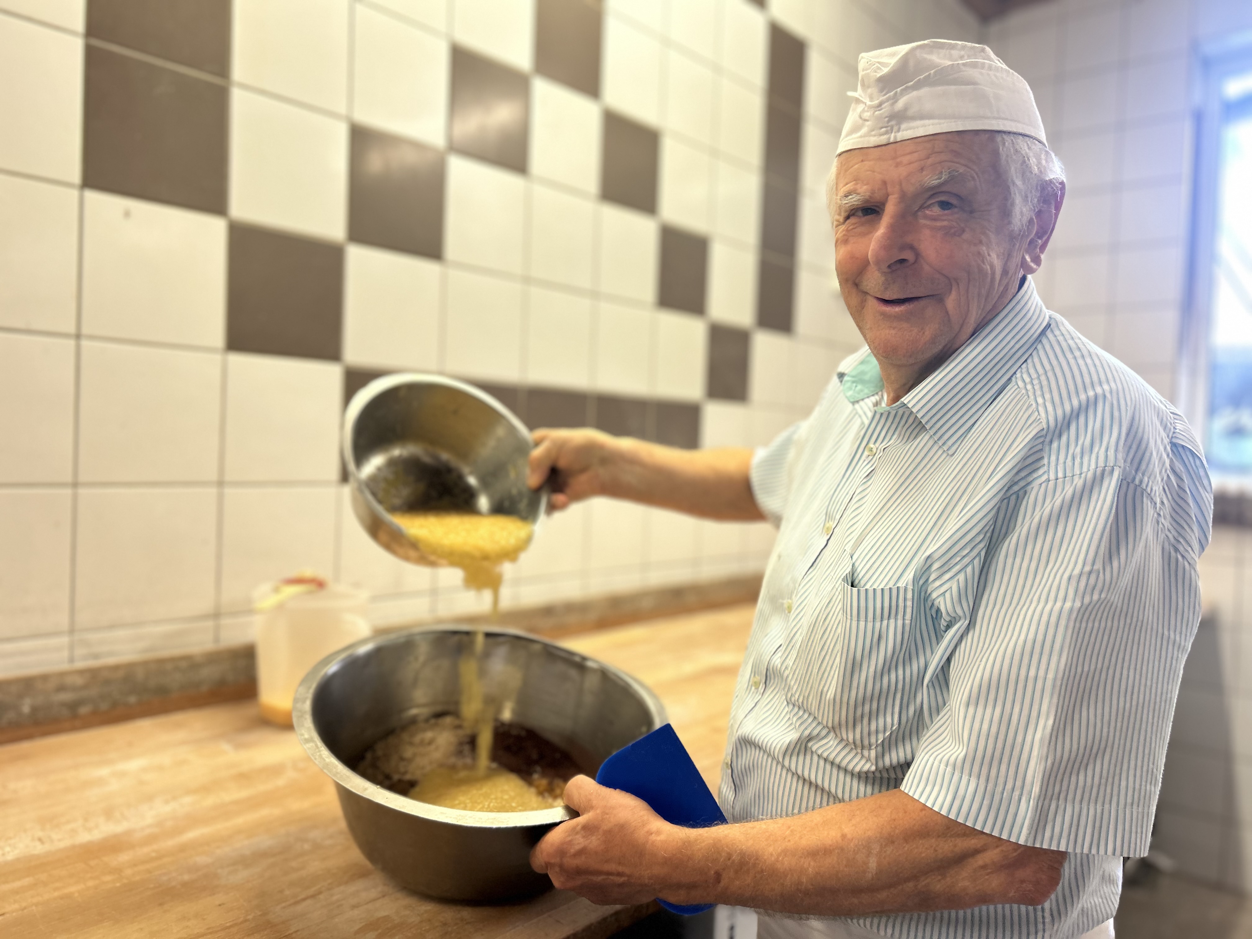 Mit geschultem Augenmaß rollt Willi Weißgerber im Handumdrehen den Hefeteig perfekt kreisrund für das große Backblech aus, das er vorher großzügig mit viel Margarine bestrichen hat. „Fast schon ein Geheimtipp“, kommentiert er. Danach geht es an den Deckel der Rieser Bauerntorte. Der ebenfalls große und rund ausgerollte Teig wird mit verquirltem Ei eingestrichen und anschließend kunstvoll eingeschnitten – und zwar auf seine ganz individuelle Weise.