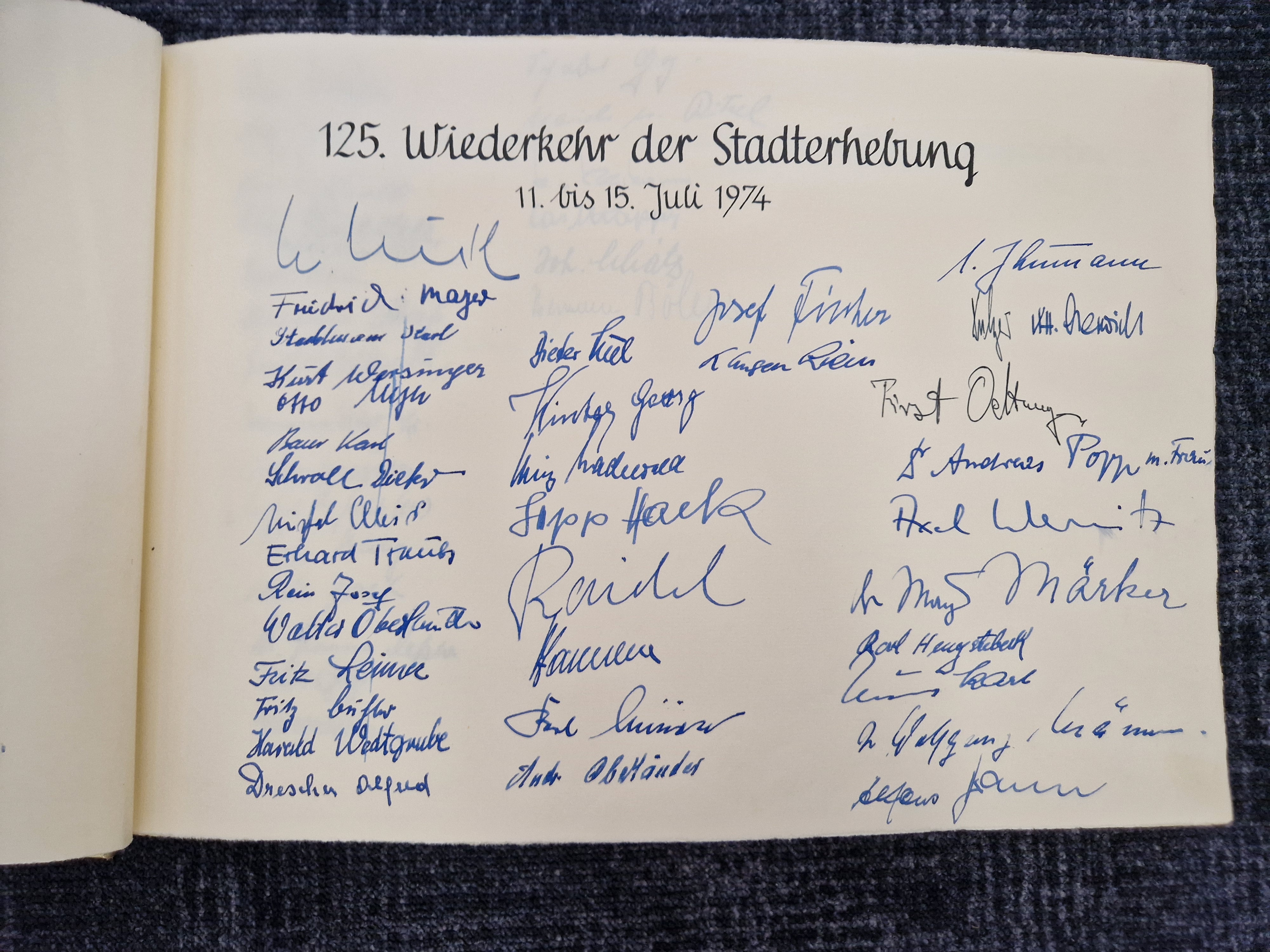 Der erste Eintrag wurde während des Festaktes zur 125-Jahrfeier der Stadterhebung getätigt. Adolf Härtl, der die 1. Unterschrift leistete, kam bei einem Verkehrsunfall am 20. Januar 1975 ums Leben.