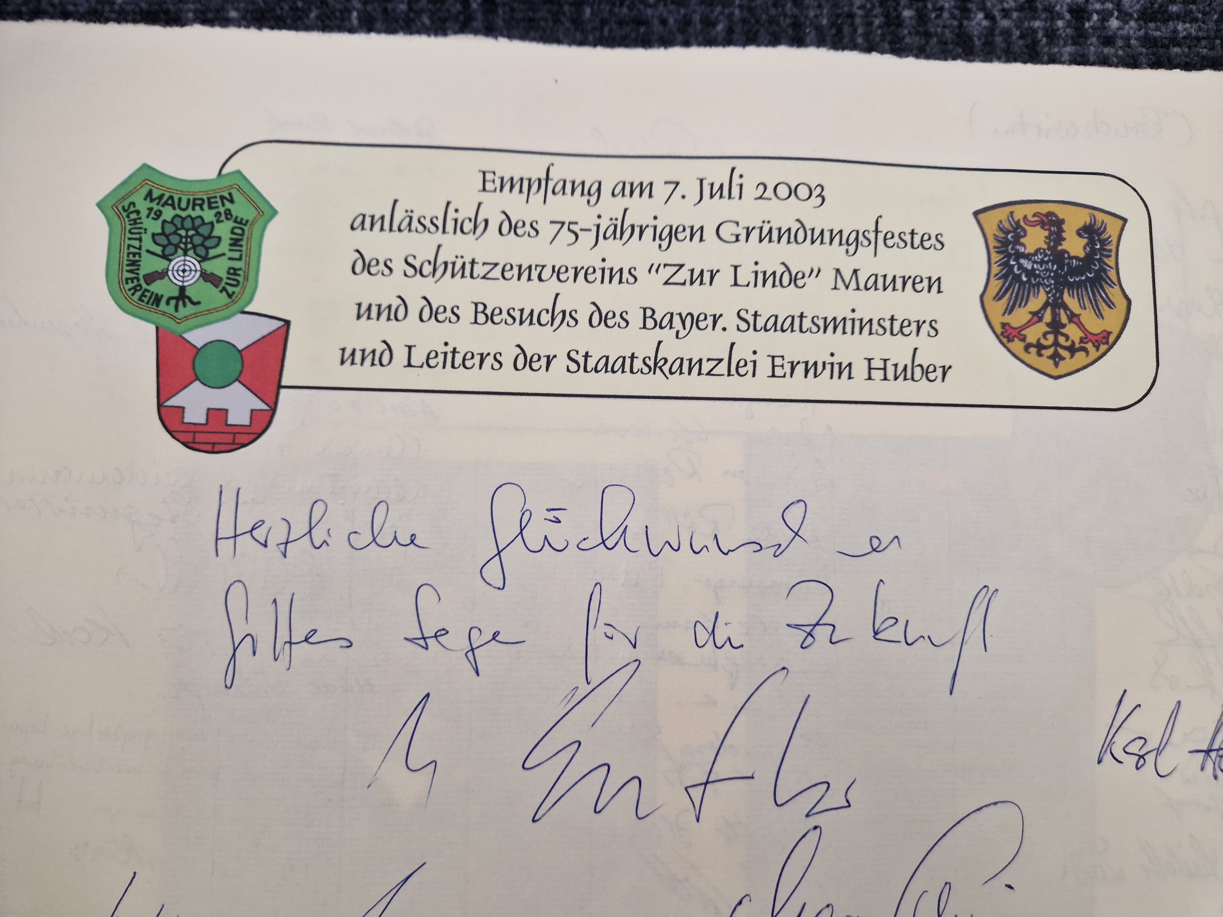 Anlässlich des 75-jährigen Jubiläums des Schützenvereins „Zur Linde“ Mauren war der damalige bayerische Staatsminister und Leiter der bayerischen Staatskanzlei Erwin Huber nach Harburg gekommen. Als Höhepunkt seines Besuchs verewigte er sich im Goldenen Buch der Stadt.