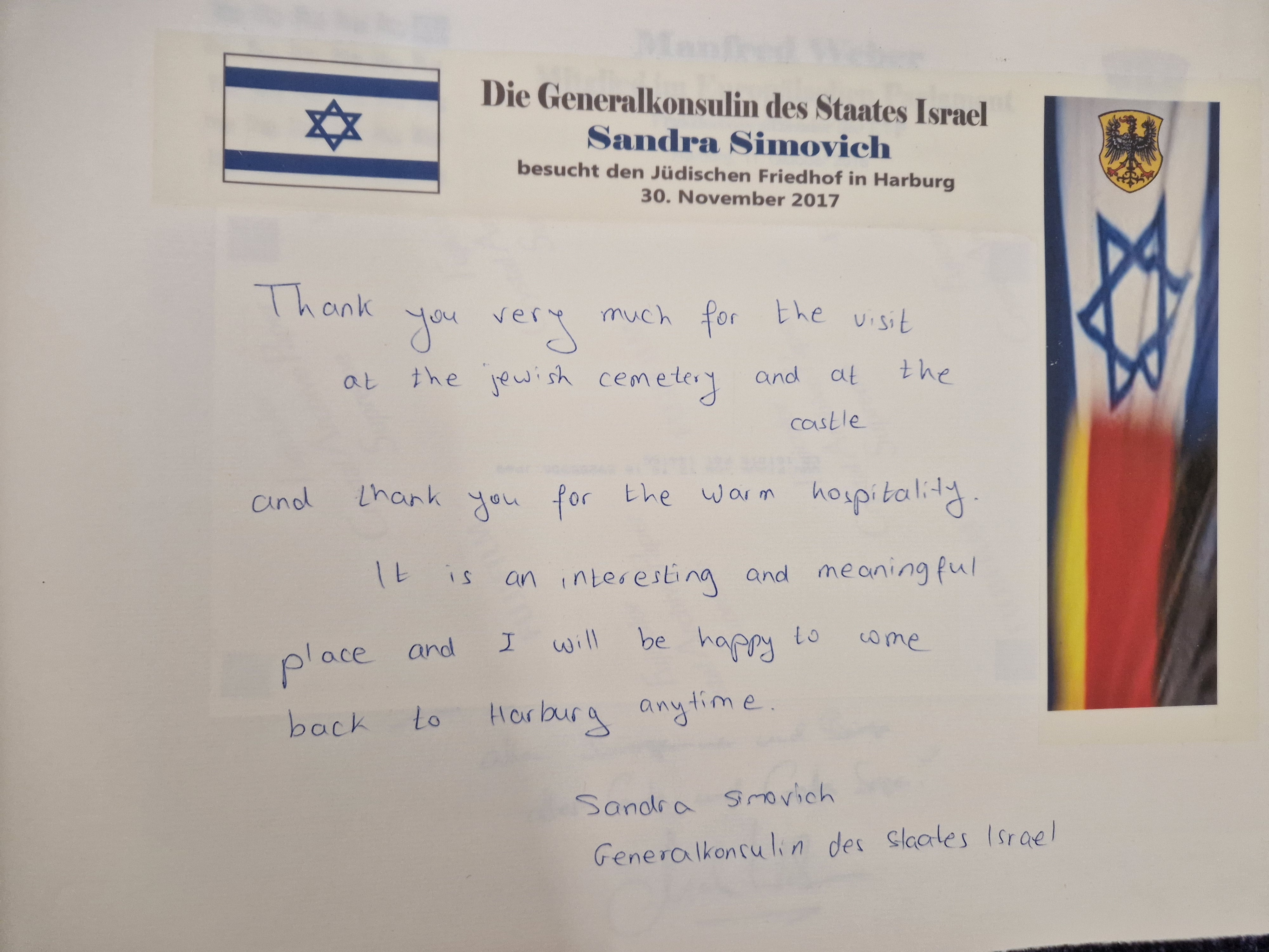 346 Jahre später besuchte die damalige Generalkonsulin Israels Sandra Simovich den Friedhof. Sie selbst war zu diesem Zeitpunkt gerade einmal drei Monate im Amt, das sie bis August 2021 ausübte.
