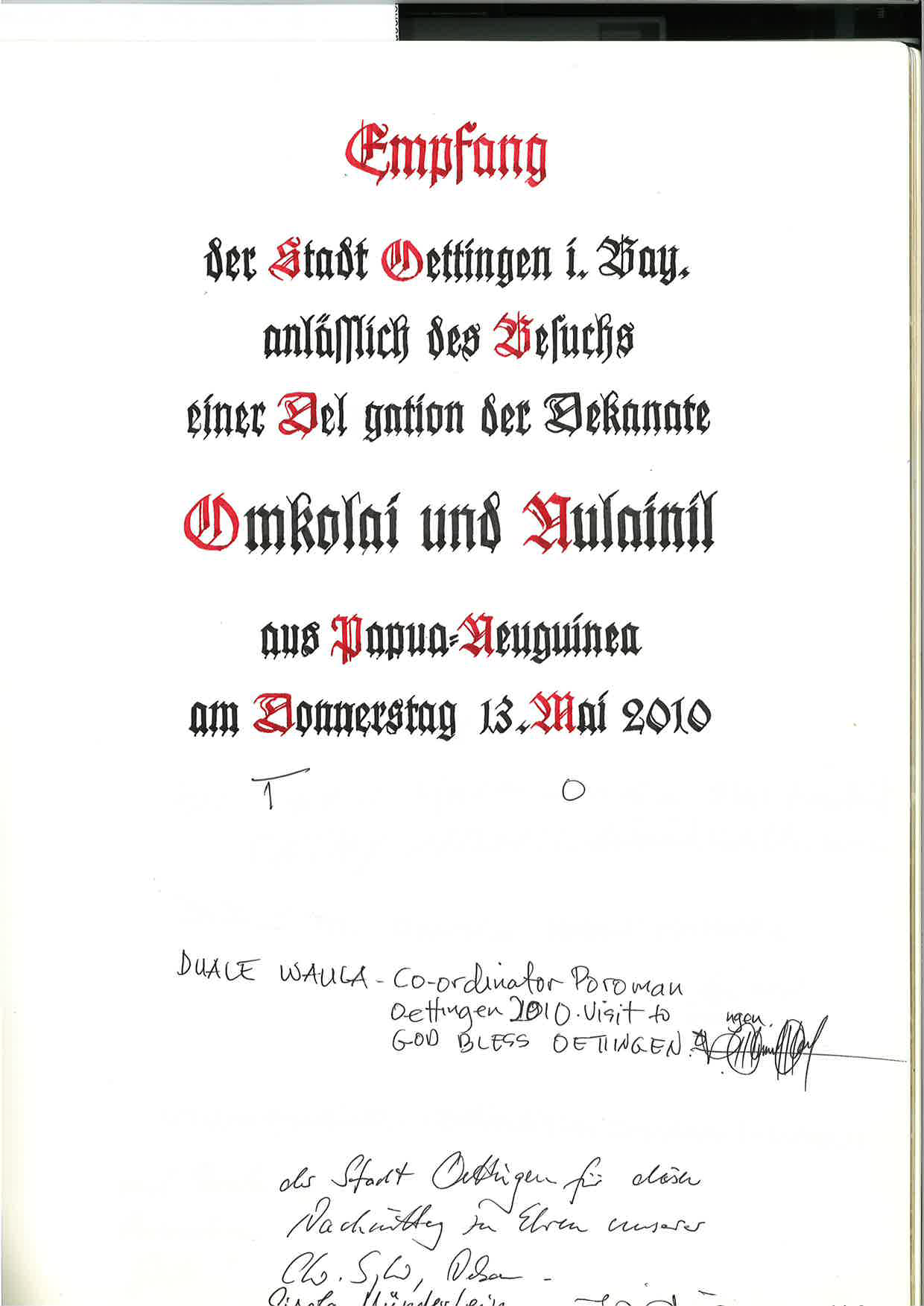 Am 13. Mai 2010 besuchte eine Delegation der Dekanate Omkolai und Nulainil die Stadt Oettingen in Bayern und trug sich dabei in das Goldene Buch der Stadt ein.