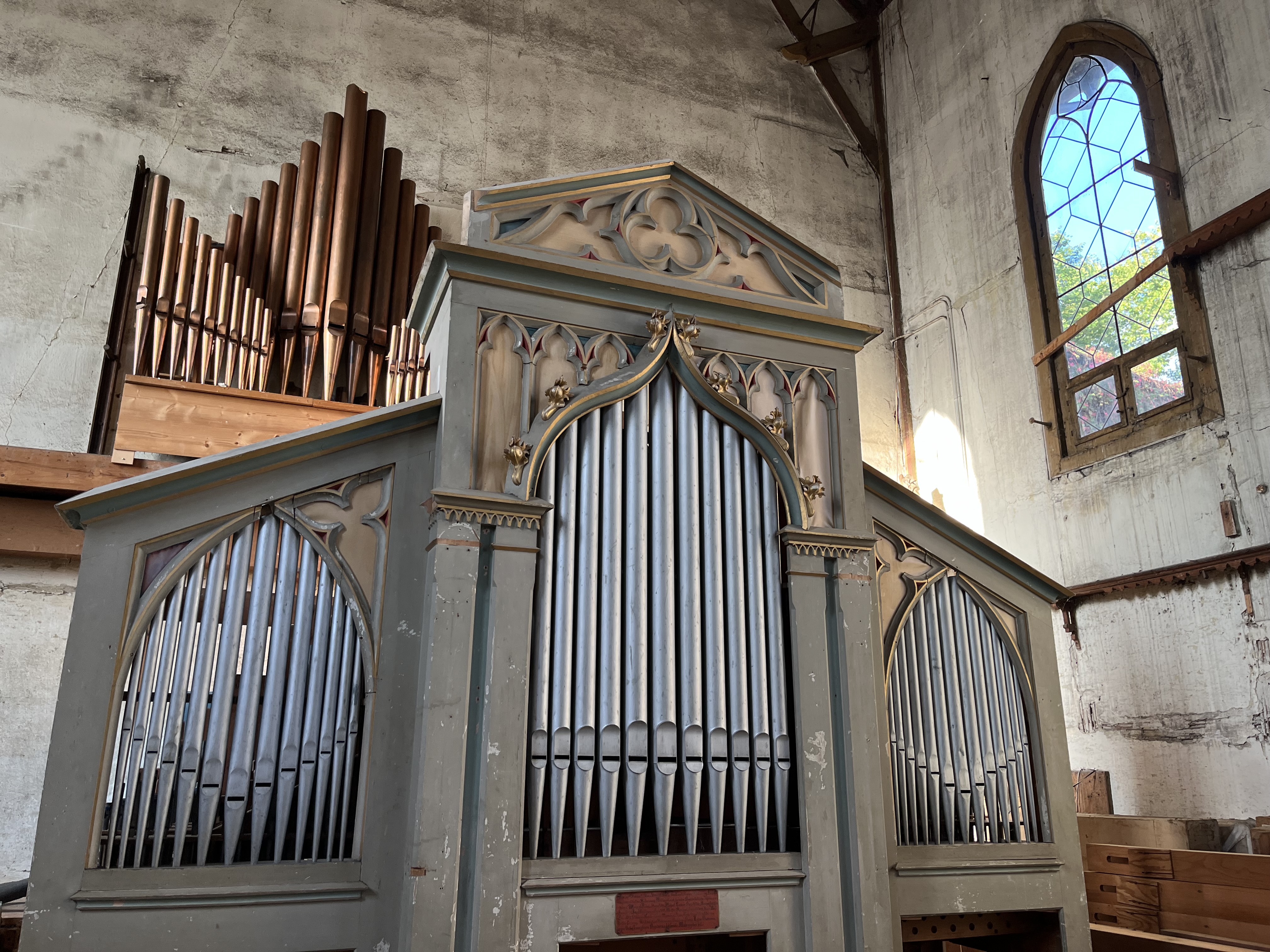 Hier jubilieren müssten Steine und Holz im neugotischen Orgelsaal der ehem. Oettinger Orgelbaufabrik Steinmeyer, die in 154 Jahren 2.400 Orgeln hergestellt hat. Zwischen Spitzbogenfenstern ist aufgereiht, woraus die Königin der Instrumente im einzelnen besteht: Windladen, Prospekte und vor allem Pfeifen aller Arten und Größen.