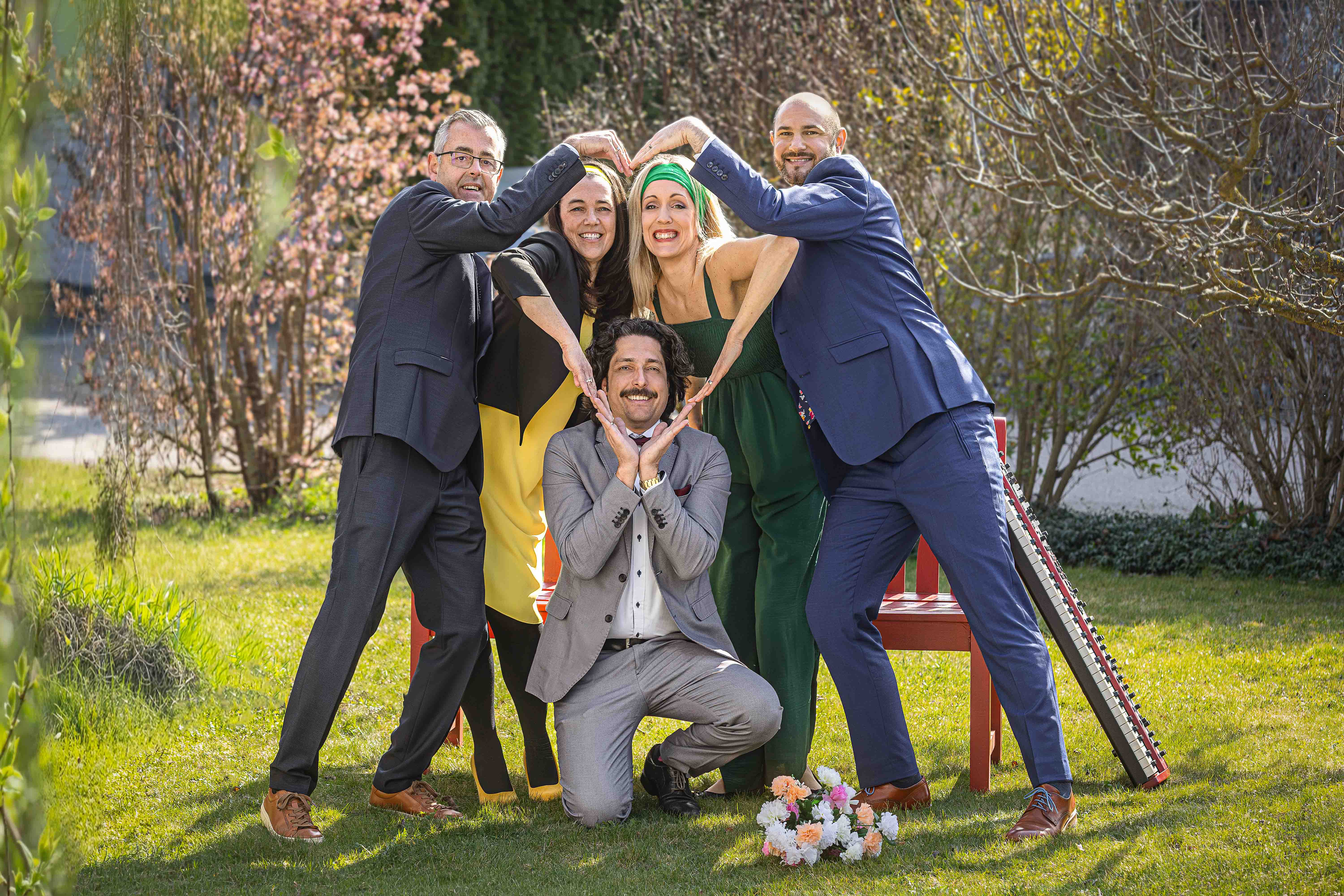 01 Im Liebesrausch (von links): Marcus Prügel, Sabine Hensold, Gerhard Munk, Clarissa Bühler, Alexander Neumeier (Foto: Studio Herzig) 02 Mehr Liebe (von links): Clarissa Bühler, Marcus Prügel, Gerhard Munk, Sabine Hensold, Alexander Neumeier (Foto: Studio Herzig) Bild: Studio Herzig