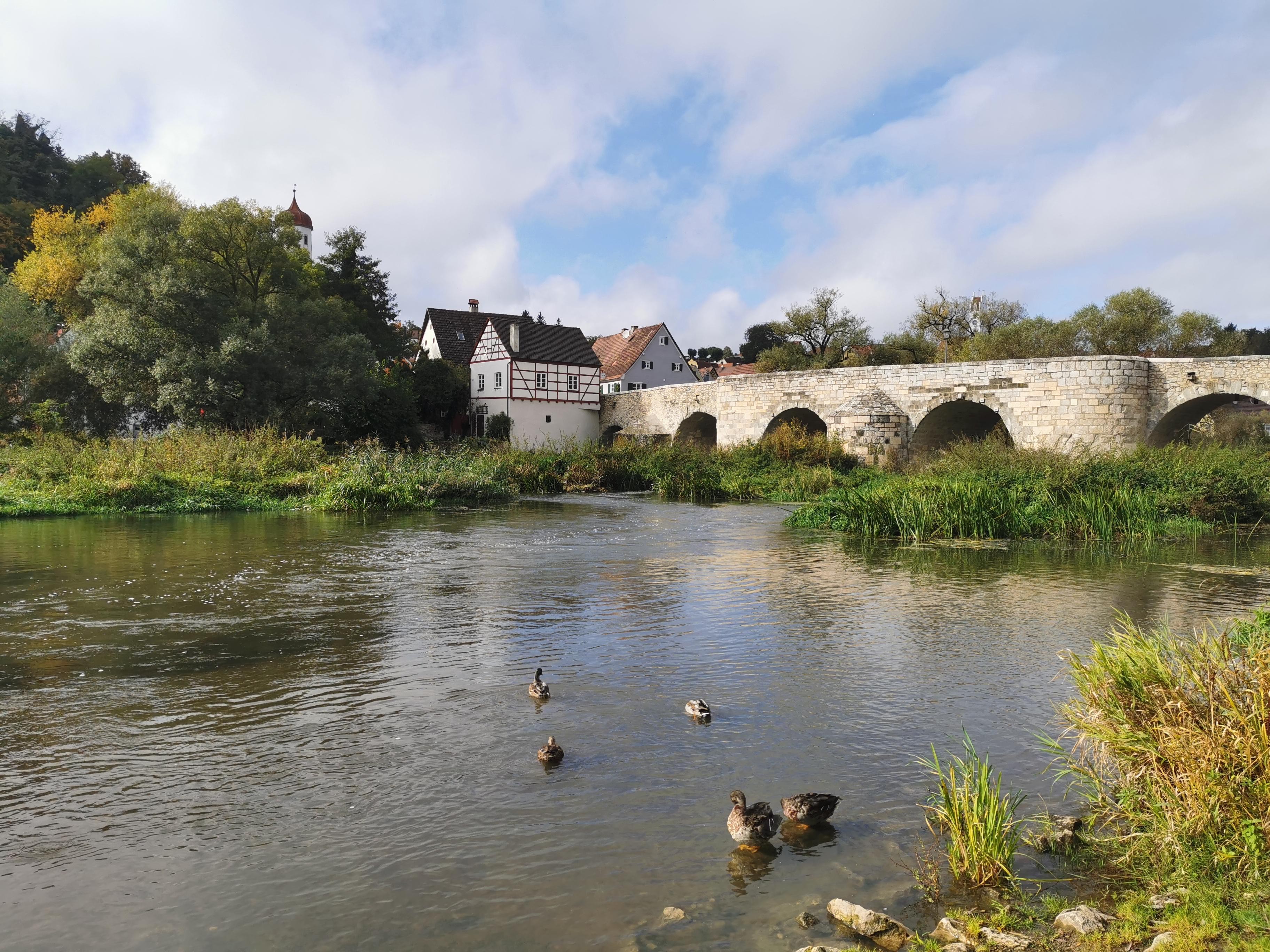 Das Bild zeigt den Wörnitzstrand Harburg mit Blick zur Alten Brücke. Bild: Wolfgang Stolz