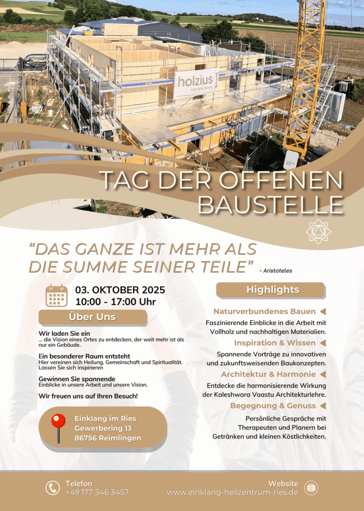 Am Freitag öffnet das entstehende Heil- und Seminarzentrum Einklang in Reimlingen erstmals seine Türen für die Öffentlichkeit. Unter dem Motto „Die Entstehung einer Vision“ erwartet Besucher ein abwechslungsreiches Programm mit spannenden Vorträgen, Einblicken in das Bauprojekt und einem musikalischen Höhepunkt am Abend.
