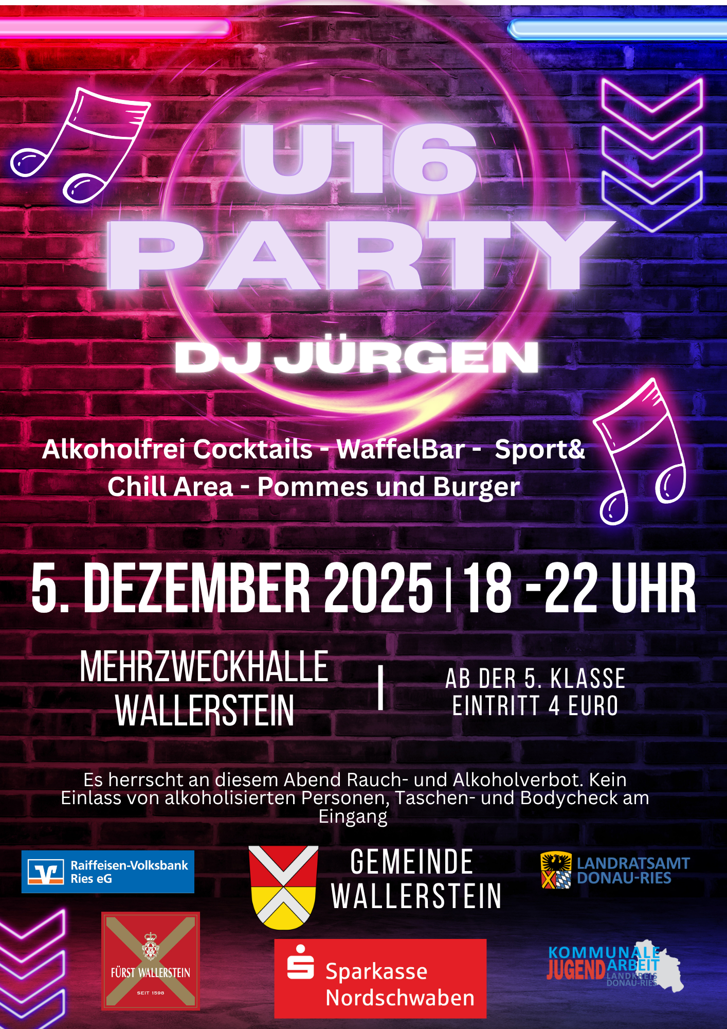 Am 5. Dezember organisiert die Gemeinde Wallerstein eine U16-Party in der Mehrzweckhalle. Hier dürfen sich alle Jugendlichen im Alter von 12-15 Jahren zwischen 18:00 und 22:00 Uhr zum Feiern treffen.