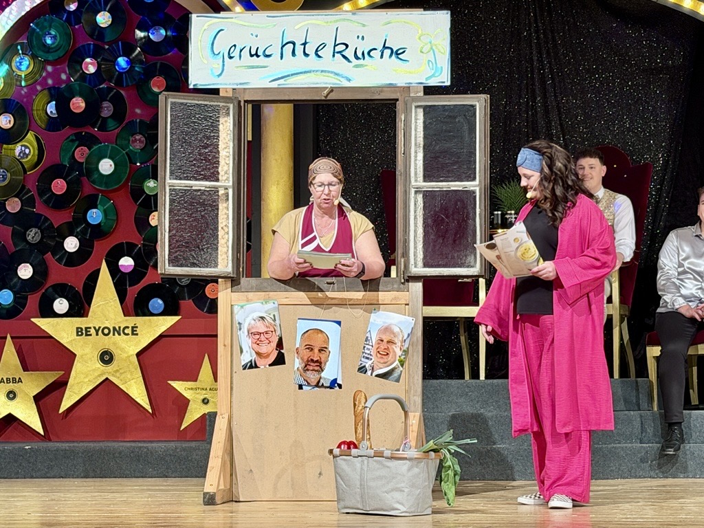 Traditionell wurde es mit dem Auftritt der Minigarde, die den Blauen Marsch präsentierte. Für zahlreiche Lacher sorgte anschließend ein Sketch über den WhatsApp-Chat einer Kita-Gruppe. Unterschiedlichste Erziehungsstile und kulturelle Welten prallten dabei aufeinander – während die Mamas fleißig tippten, reagierten die Papas konsequent mit einem Daumen nach oben. Eine Situation, die vielen im Saal vertraut sein dürfte. Entsprechend groß war der Applaus. Den Abschluss des ersten Blocks bildete die Prinzengarde mit einem klassischen Gardemarsch auf höchstem Niveau.