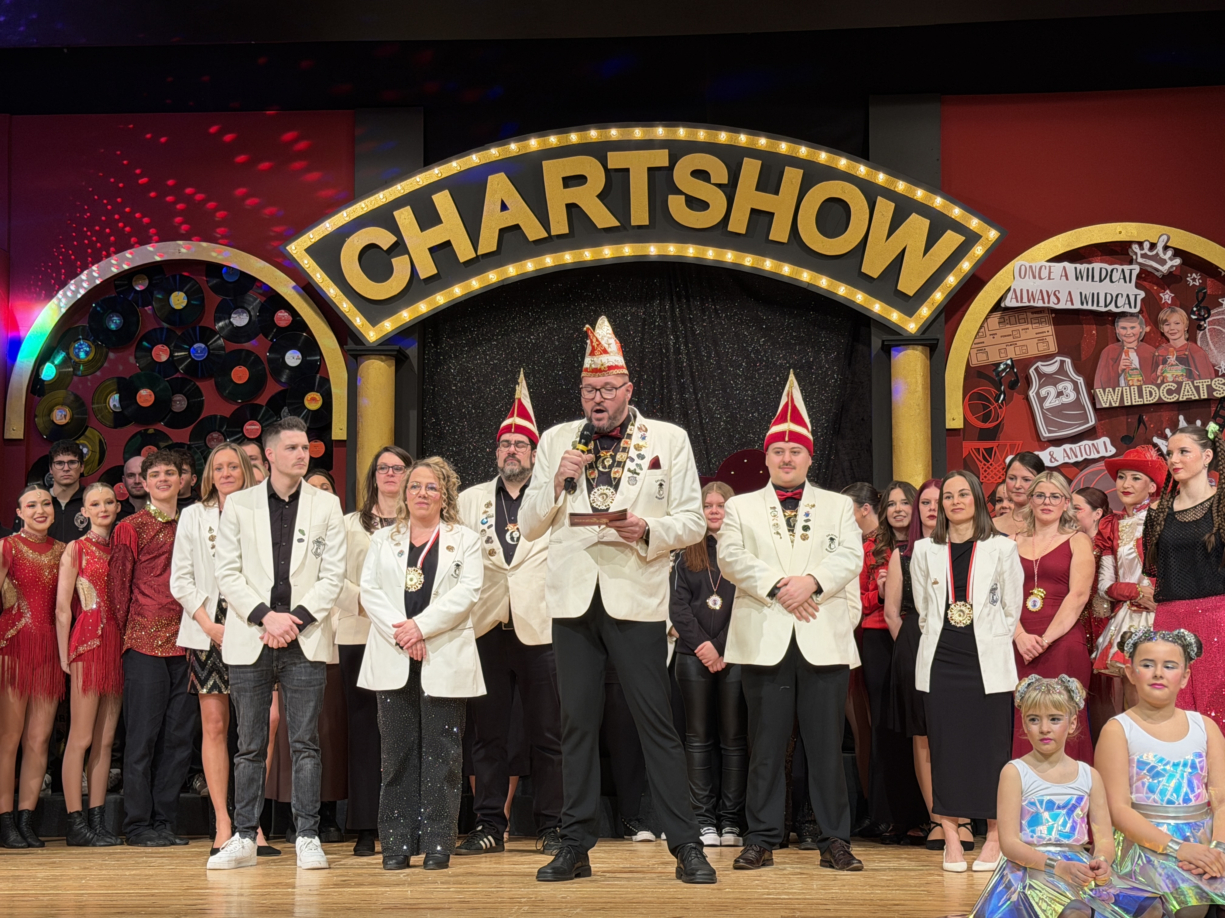Im Anschluss zog der große Hofstaat ein. Prinzessin Laura I. (Rib) und Prinz Sven I. (Lanzer) präsentierten gemeinsam mit Mundschenk Luca und Hofmarschall Luisa Burlefinger eine Reise durch die Musikgeschichte – von ikonischen Hits der 60er-Jahre bis in die Gegenwart, ganz im Stil einer ultimativen Chartshow. Dabei fehlten auch persönliche Worte nicht: „Prinz Sven, Maler mit Herz und Seele, doch heute wählt er nicht die Farbe, sondern Konfetti“, hieß es augenzwinkernd. Prinzessin Laura betonte zudem: „Die Prinzengarde ist ein fester Teil von mir – Fasching lebt vom Miteinander.“