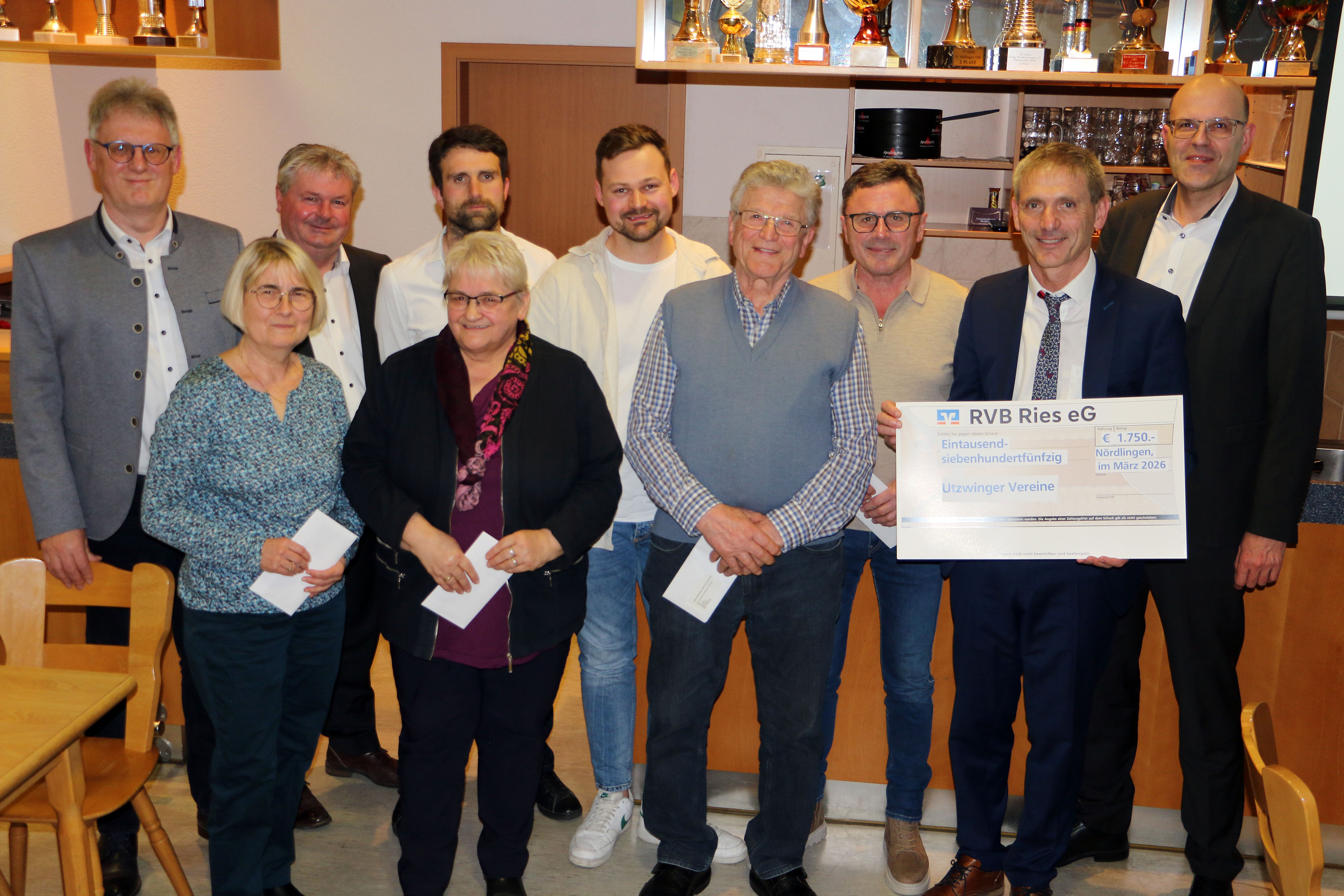 Simon Rupprecht, Regionalleiter Wemding (links), und Vorstand Bernd Frisch (rechts) mit den Vertreterinnen und Vertretern der Amerbacher Vereine. Bild: Jasmin Hönle
