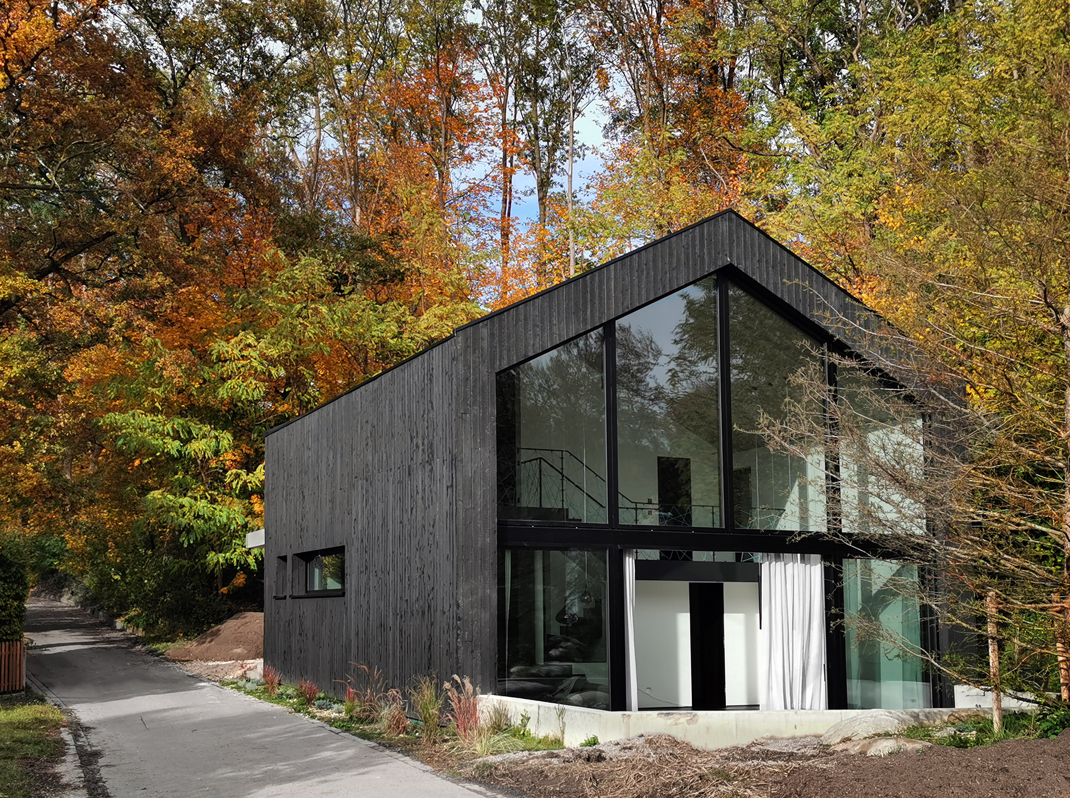 Die Architektur des Hauses greift den Hangverlauf des Grundstücks auf und lässt so einen fließenden Übergang von der Eingangsseite zur Gartenseite entstehen. Die großzügige Glasfront des Süd-Giebels sorgt für viel Licht im Inneren und gewährt einen atemberaubenden Blick auf den neu angelegten Garten auf dem Grundstück. Eine der besonderen Eigenschaften des Hauses ist der Galeriebereich im Obergeschoss, von dem aus nicht nur das großzügige Wohnzimmer, sondern auch die naturnahe Umgebung bewundert werden kann.
