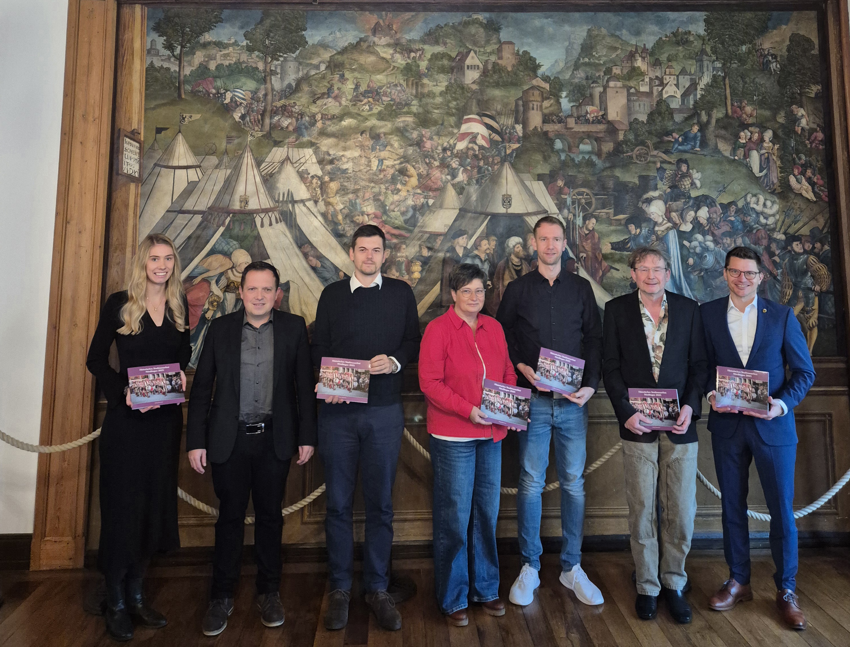 V. l.: Helena Ott (Leiterin OB-Büro und Hauptverwaltung), Daniel Wizinger (Leiter Sachgebiet Tourismus und Veranstaltungen), Stadtarchivar und Stadtheimatpfleger Dr. Johannes Moosdiele-Hitzler, Birgit Kapeller (Hauptverwaltung), Johannes Hafner (Tourist-Information), Matthias Steinmeier (Verlag Steinmeier) und Oberbürgermeister David Wittner. Bild: Nina Hellriegel / Stadt Nördlingen