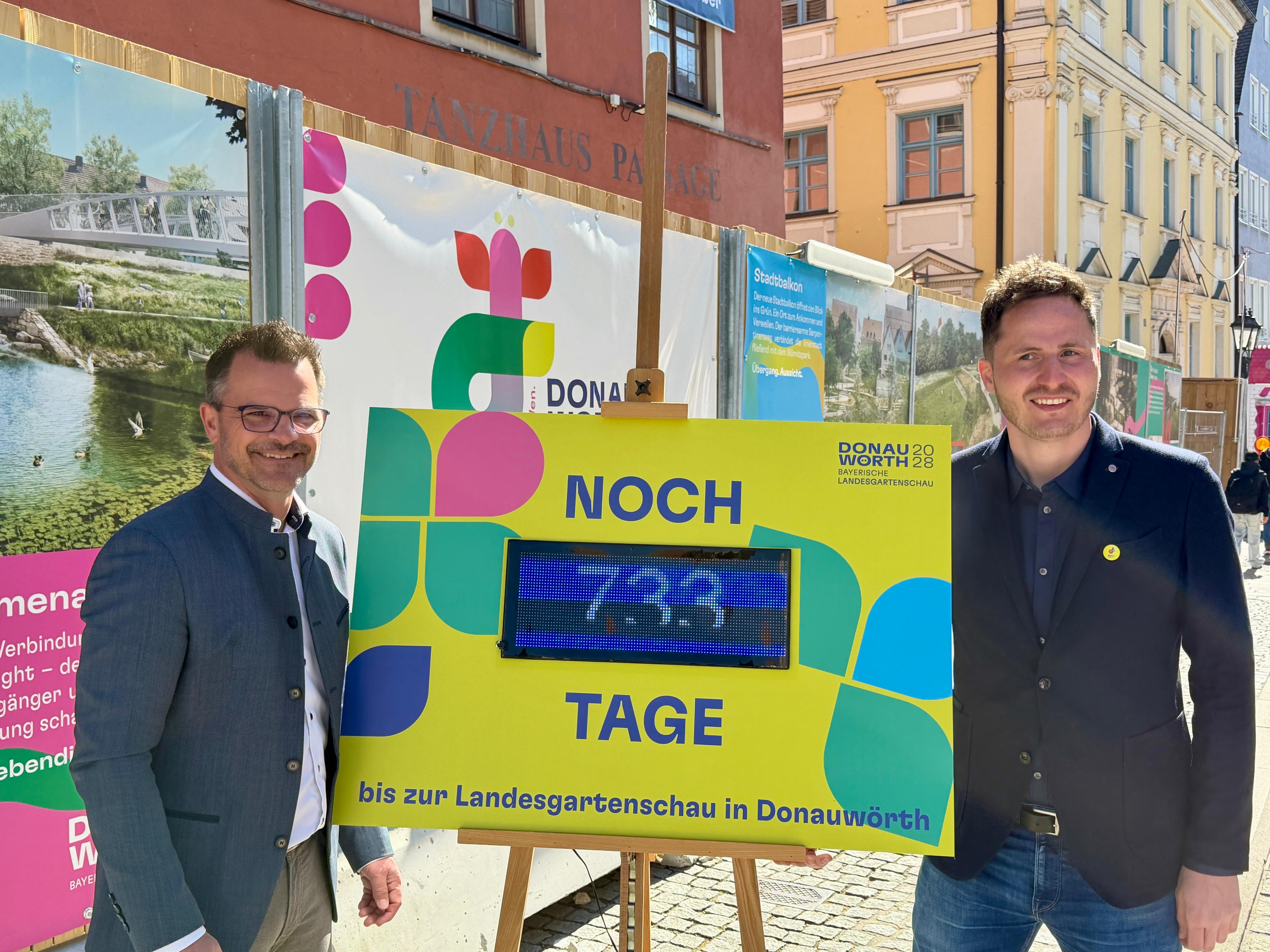 Oberbürgermeister Jürgen Sorré (l.) und Geschäftsführer Patrick Wörle verkünden: In 733 Tagen beginnt die Landesgartenschau in Donauwörth! Bild: Matthias Stark