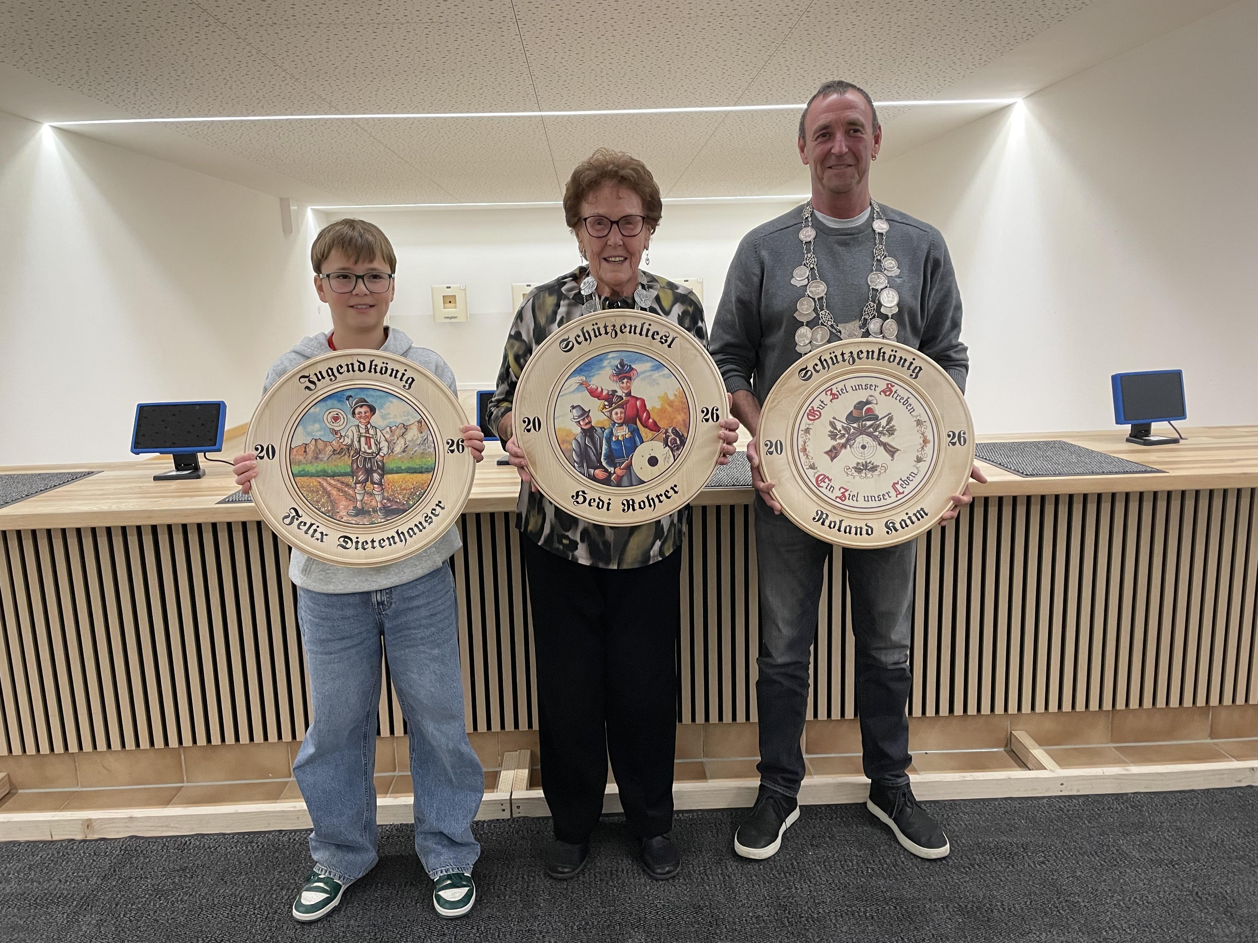 Nur strahlende Gesichter bei der Siegerehrung in der neuen Schießanlage (von links nach rechts): Jugendkönig Felix Dietenhauser, Schützenliesl Hedi Rohrer, Schützenkönig Roland Kaim. Bild: Helmut Rasp