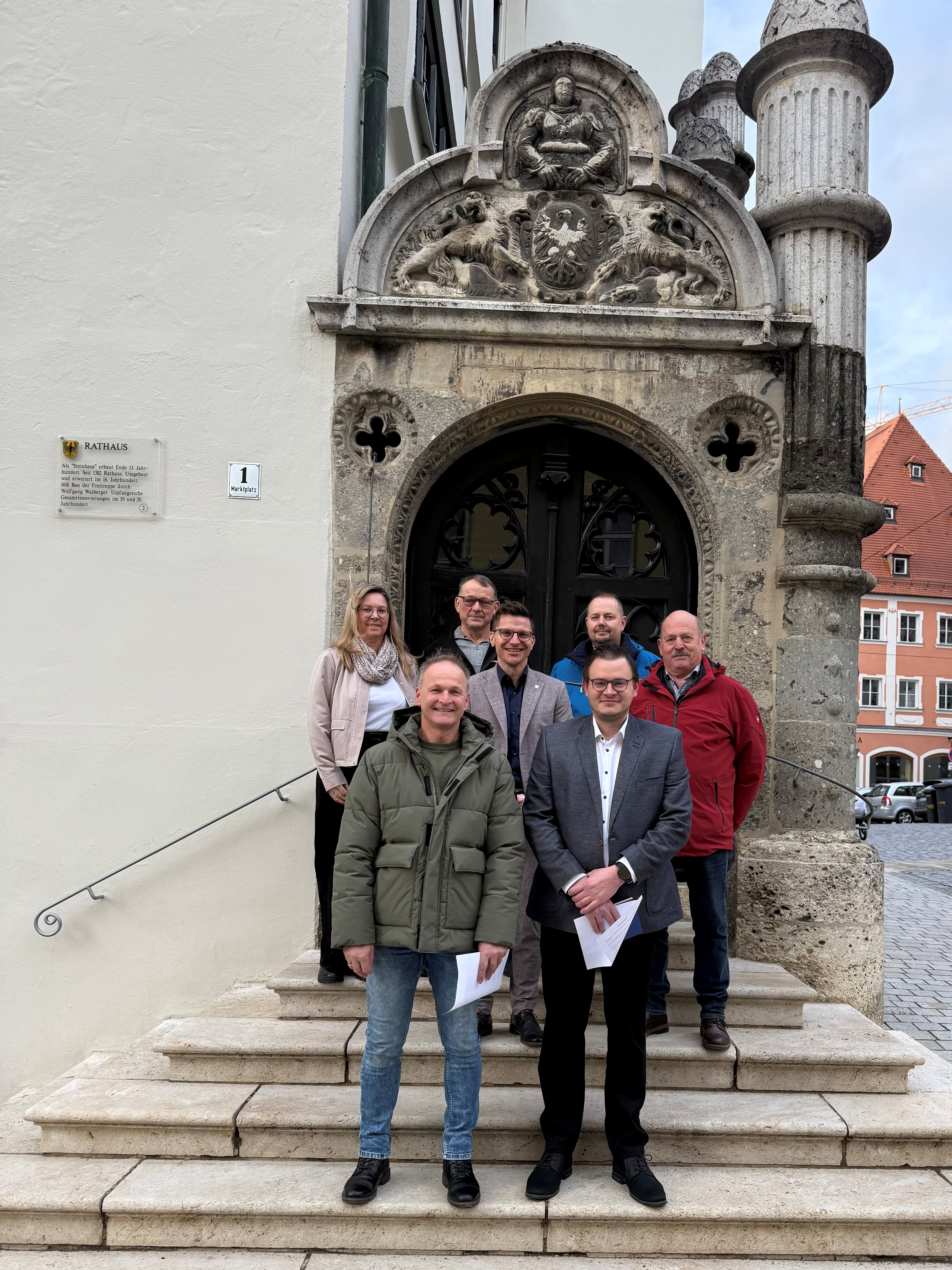 Hinten von links: Petra Payer (Leiterin des Ordnungsamts der Stadt Nördlingen), Thomas Schiele (Obmann der Feldgeschworenen Holheim), Oberbürgermeister David Wittner, Johannes Kleemann (Obmann der Feldgeschworenen Dürrenzimmern) sowie Rudolf Weber (Ortssprecher von Holheim)