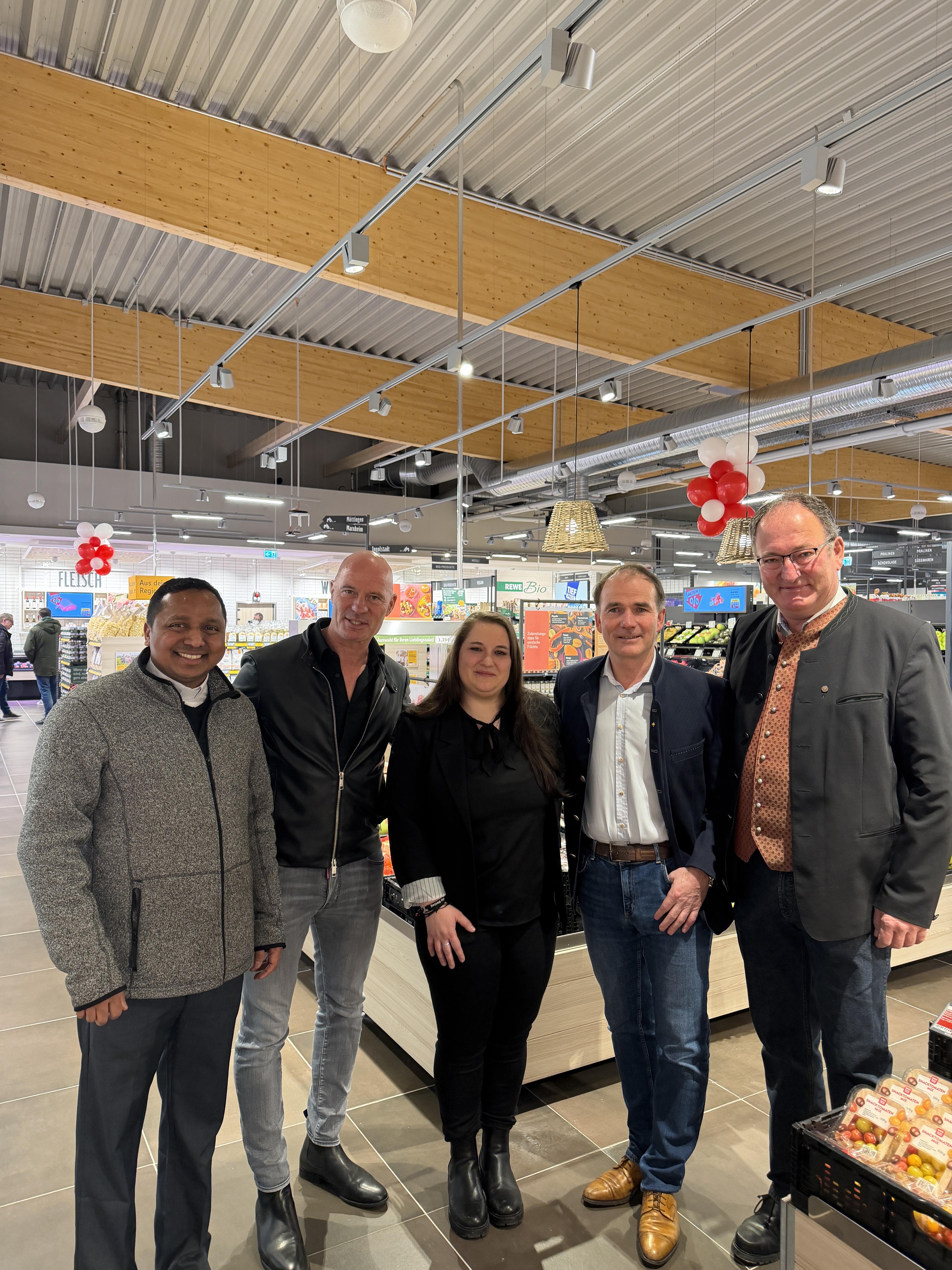 Bei der offiziellen Eröffnung am Mittwochabend, 11. Februar 2026. Auf dem Bild zu sehen (von link): Pater Vinson, Willi Ihle, Marktleiterin Rebekka Kopp, Peter Pletschacher und Bürgermeister Alois Schiegg. Bild: Matthias Stark