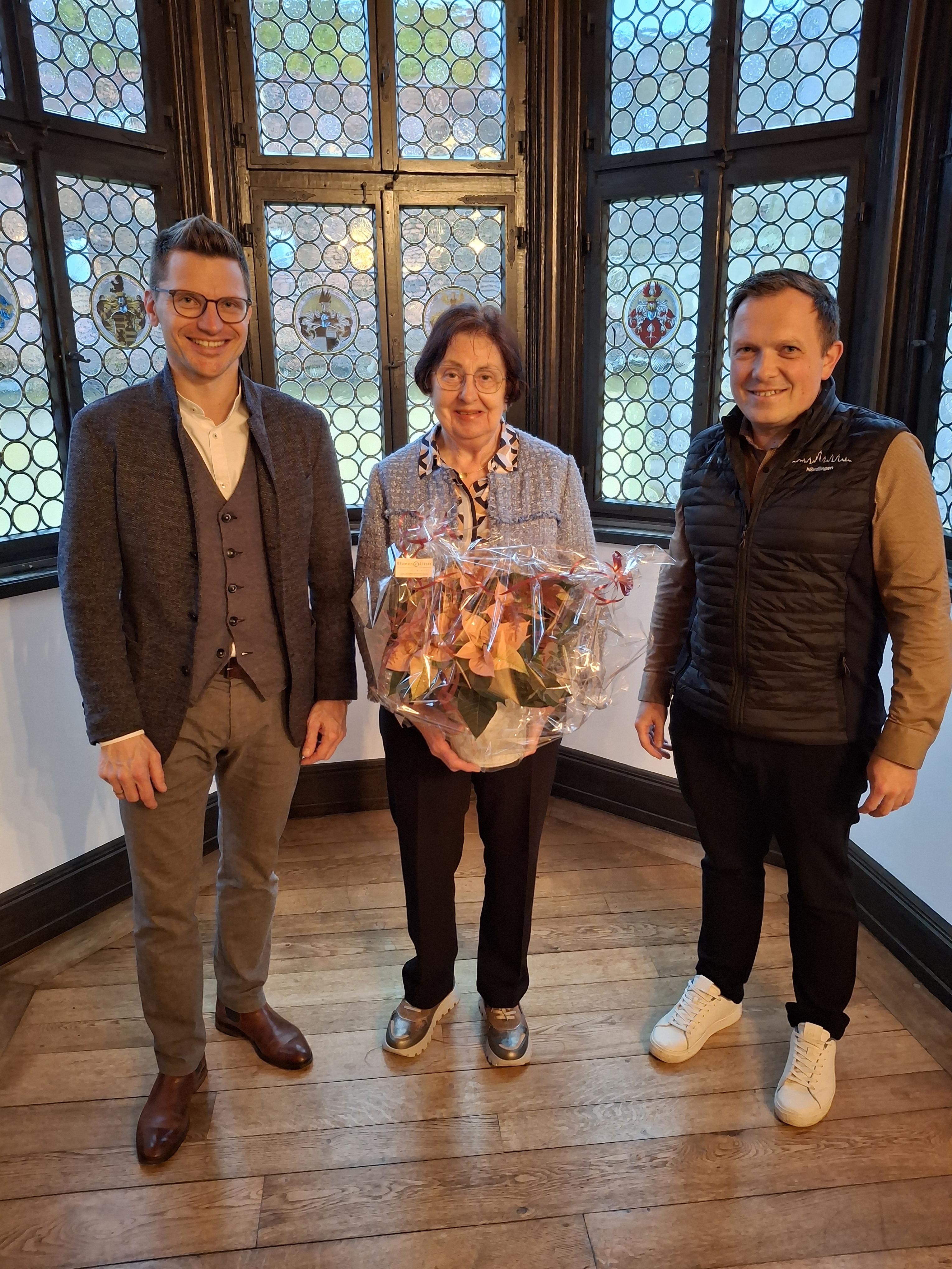 Oberbürgermeister David Wittner und Daniel Wizinger, Leiter des Sachgebiets Tourismus und Veransaltungen, verabschieden Ingrid Gottschalk nach 33 Jahren als Stadtführerin und überreichen ihr ein kleines Präsent als Dank für ihren langjährigen Einsatz. Bild: Magdalena Stimpfle