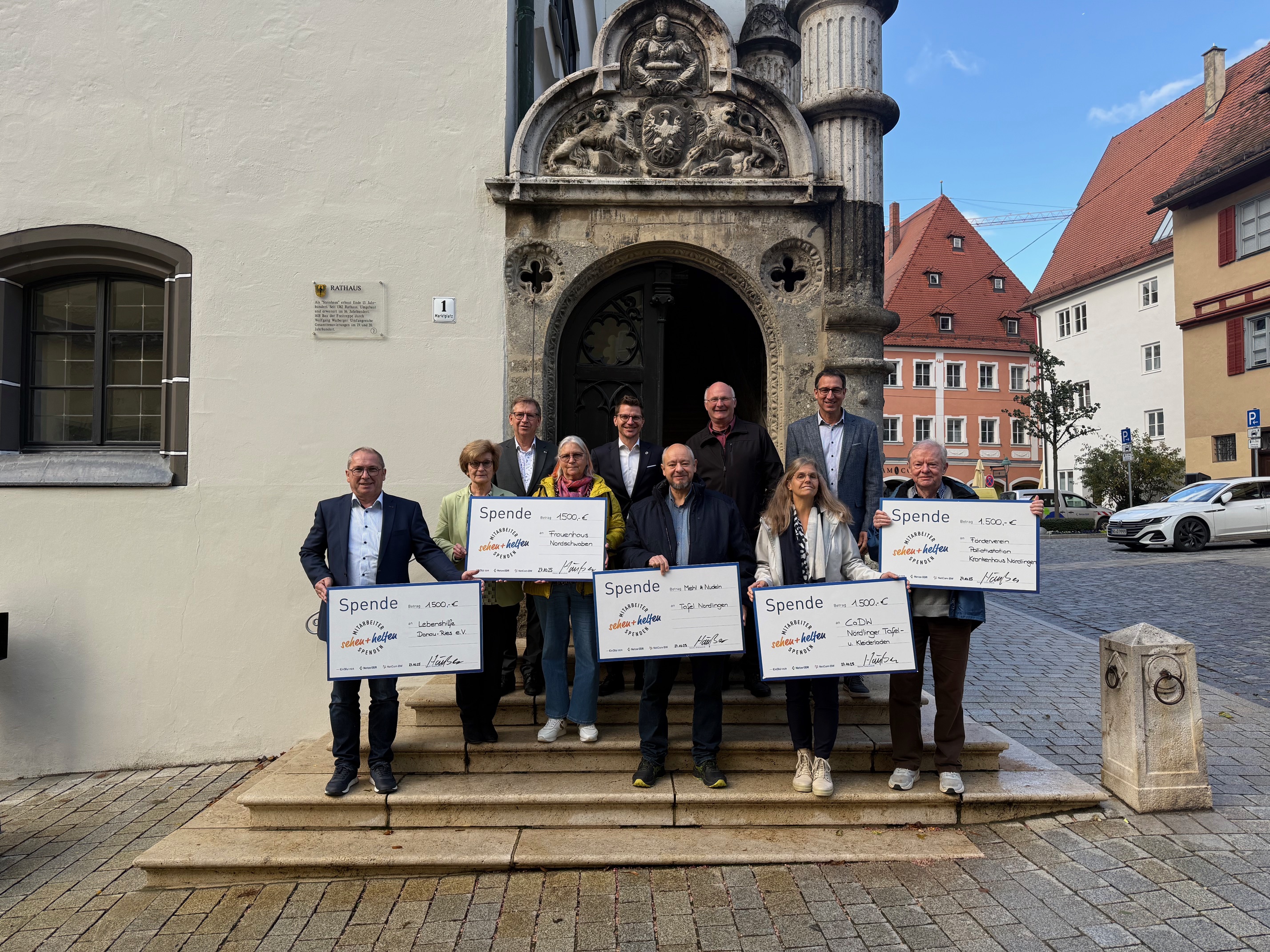 Bei der Scheckübergabe vor dem Nördlinger Rathaus (von links): Günter Schwendner (Le