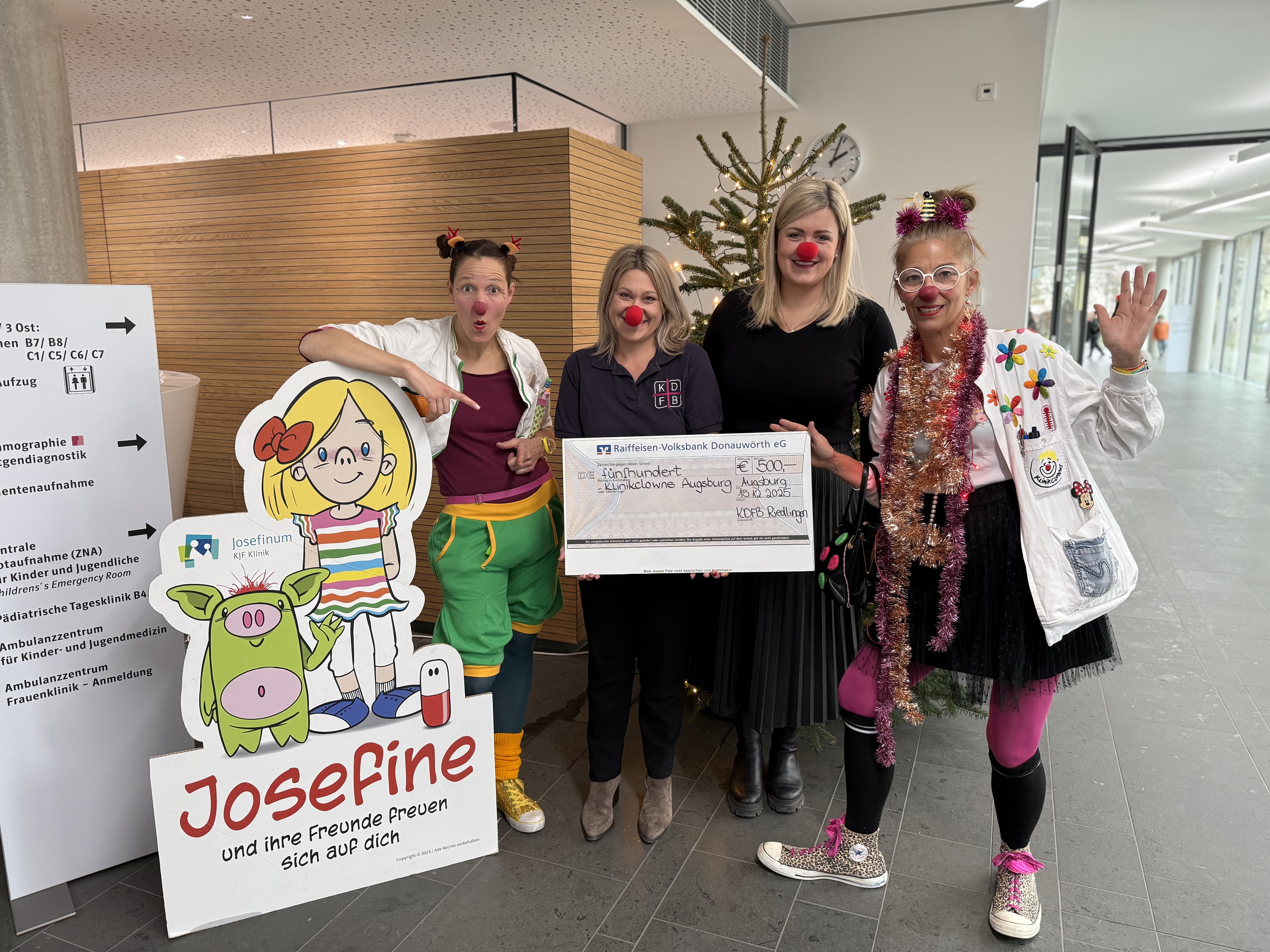 Am vergangenen Montag besuchten Manuela Schweihofer und Barbara Alt vom Frauenbund die Clowns „Dr. Belladonna“ und „Lupine“ im Augsburger Josefinum und überreichten ihnen die Spende in Höhe von 500.- Euro an die Stiftung Lachen Schenken-KlinikClowns. Die Stiftung finanziert wöchentliche Einsätze der KIinikClowns auf den Kinderstationen des Josefinums, die den kleinen Patientinnen und Patienten ihren Krankenhausaufenthalt erleichtern.