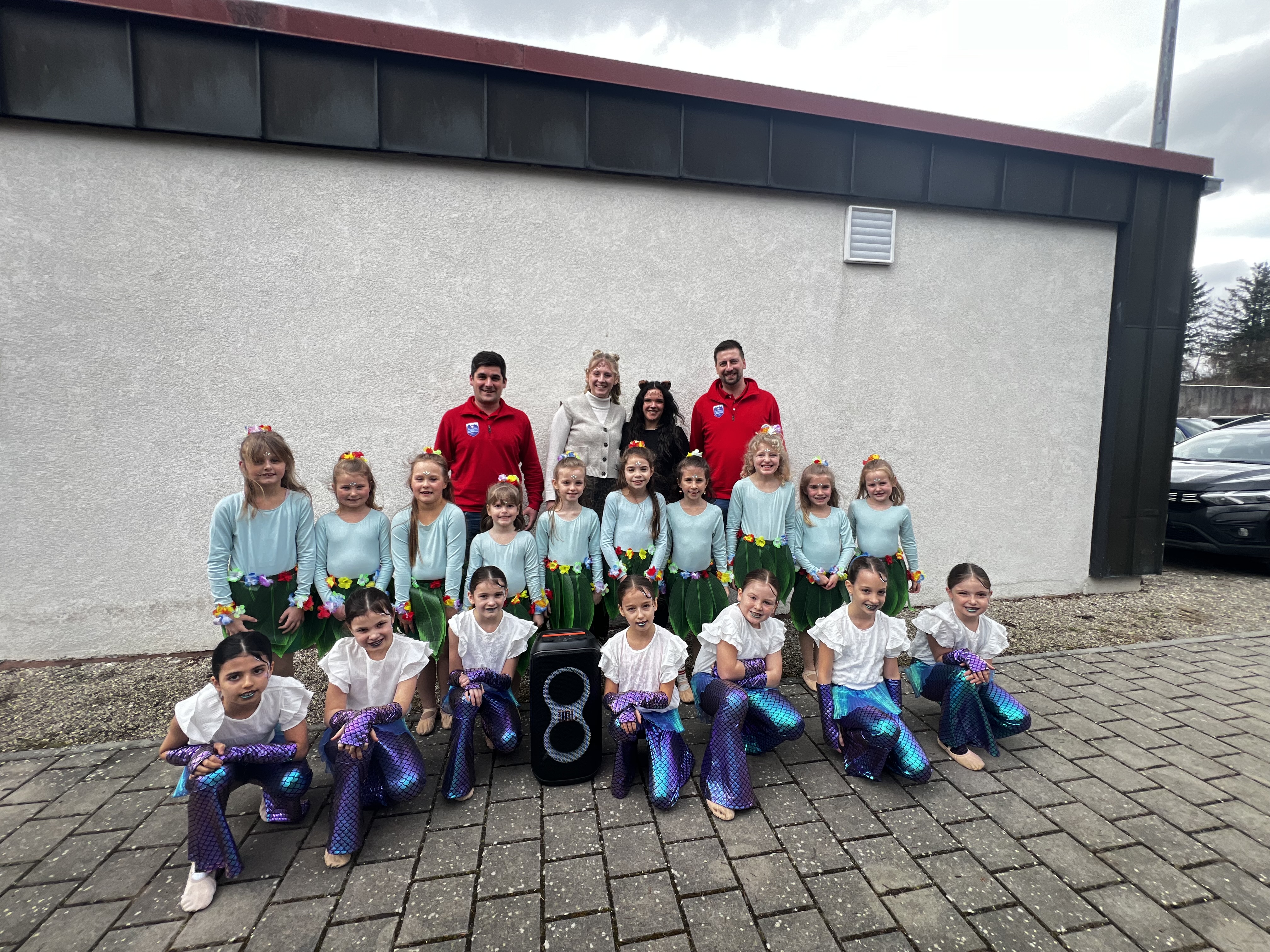 Auf dem Bild sind hinten v. l. n. r. Christian Baur (1. Vorstand der Rot-Weissen-Burgstädter e. V.), Meike Jörg und Alina Schmidt (Trainerinnen der Just Dance Tanzgruppen) und Martin Müller (2. Vorstand der Rot-Weissen-Burgstädter e. V.). In den vorderen beiden Reihen sind Tänzerinnen der Just Dance Minis und Kids zu sehen. Bild: Sina Baur