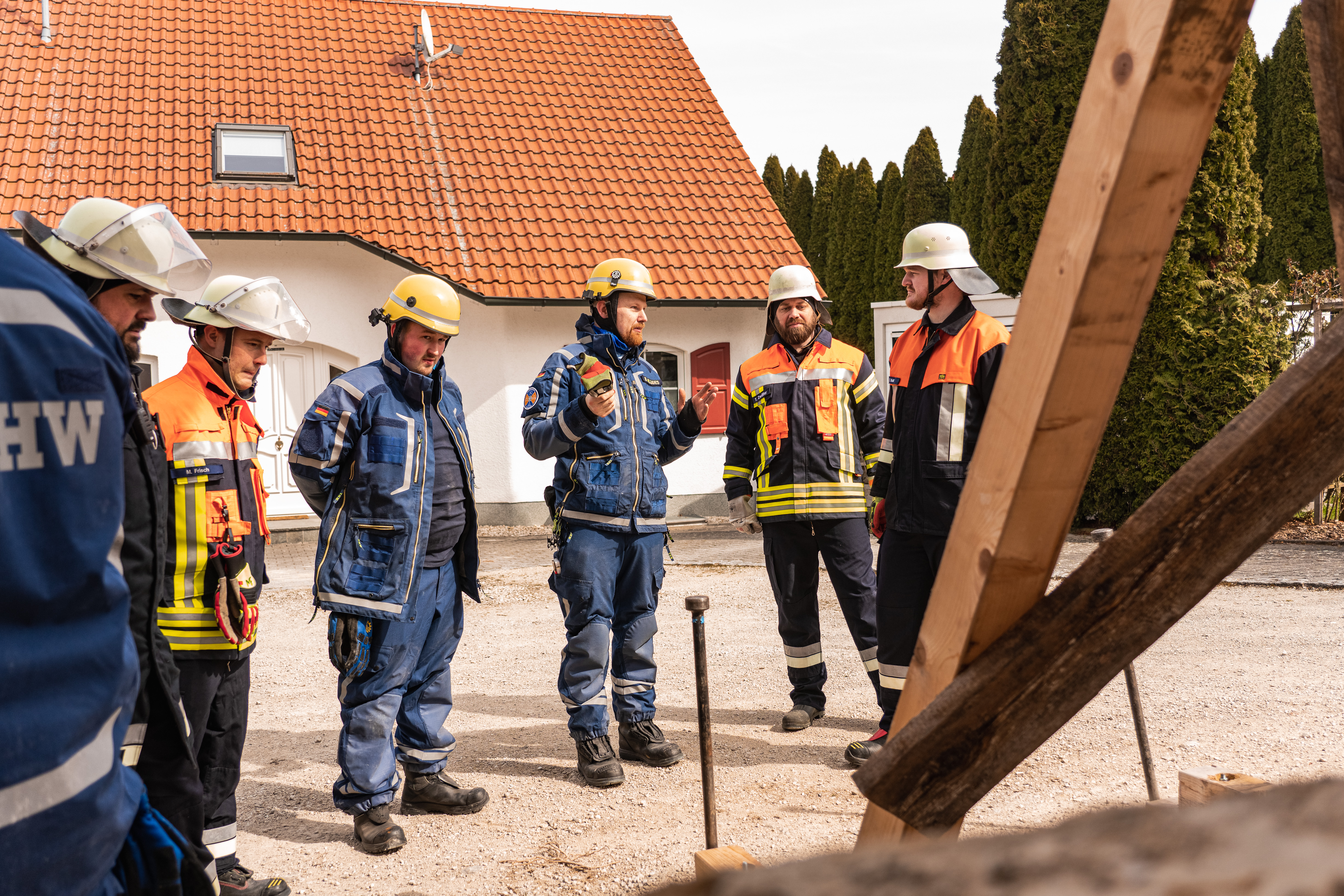 Ein weiterer Schwerpunkt war das Öffnen von Wänden. Mit druckluftbetriebenen Werkzeugen konnten die Teilnehmenden üben, gezielt Durchbrüche zu schaffen. Das ist wichtig, wenn verschüttete oder eingeschlossene Personen schnell erreicht werden müssen. Auch das Sichern von beschädigten Gebäuden wurde geübt. Mit Holzbalken entstanden stabile Stützkonstruktionen, die verhindern, dass Teile eines Hauses weiter einstürzen. Solche Maßnahmen können entscheidend sein, um Einsatzkräften ein sicheres Arbeiten zu ermöglichen.