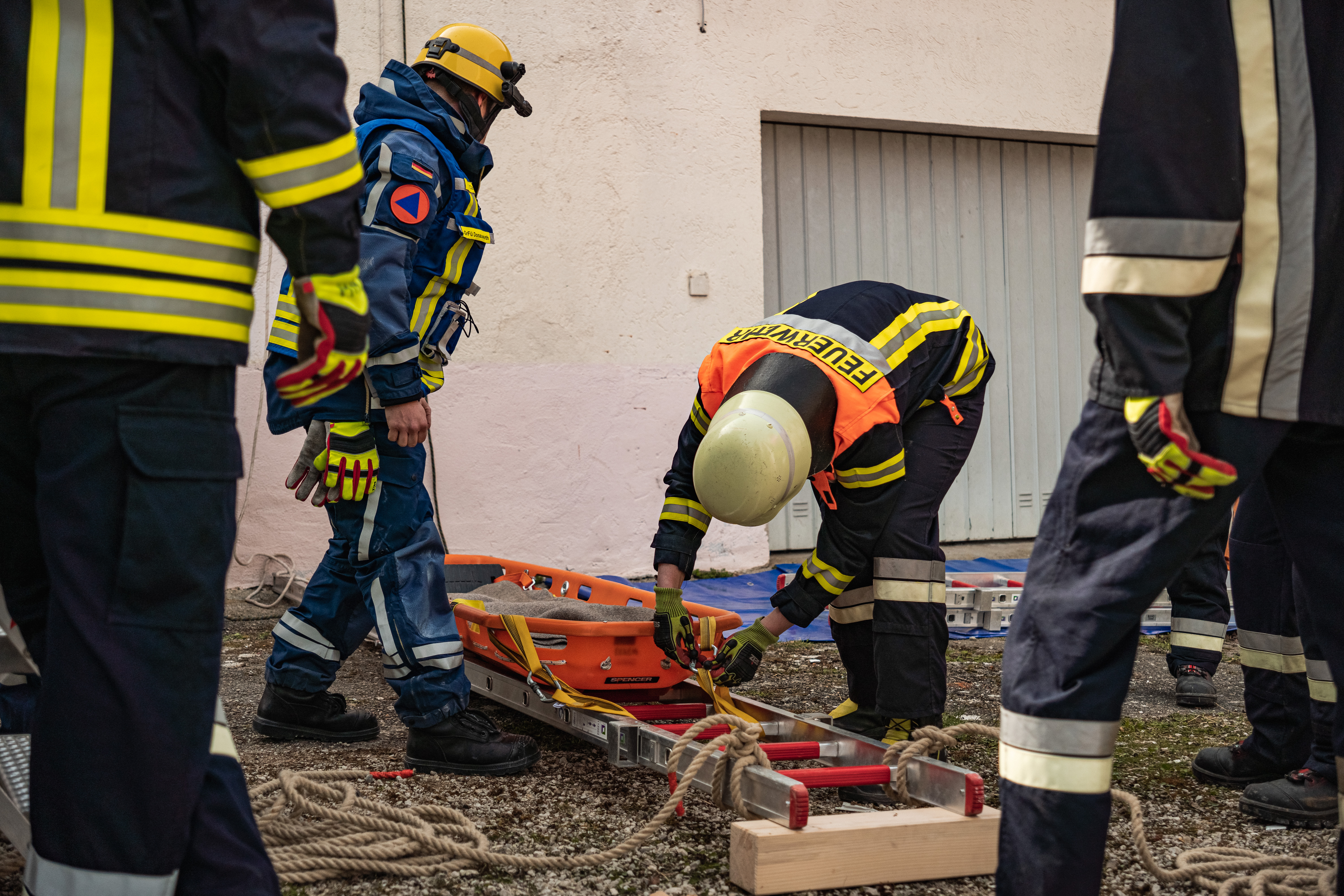 Im Mittelpunkt der Ausbildung stand unter anderem die Rettung von Menschen aus schwierigen Situationen. Wie bringt man eine verletzte Person aus dem ersten Stock ins Erdgeschoss, wenn die Treppe nicht mehr sicher ist? Genau das wurde in Hoppingen geübt. Die Einsatzkräfte zeigten einfache, aber effektive Techniken, um Menschen schonend zu retten. Dabei werden Leitern nicht nur zum Klettern verwendet, sondern unter anderem als Hebel verwendet, um Verletzte nach unten zu bringen. Für Außenstehende spannend: Es ist nicht immer hochmoderne Technik, sondern oft gekonnte Handgriffe mit einfachem Material und Teamarbeit.
