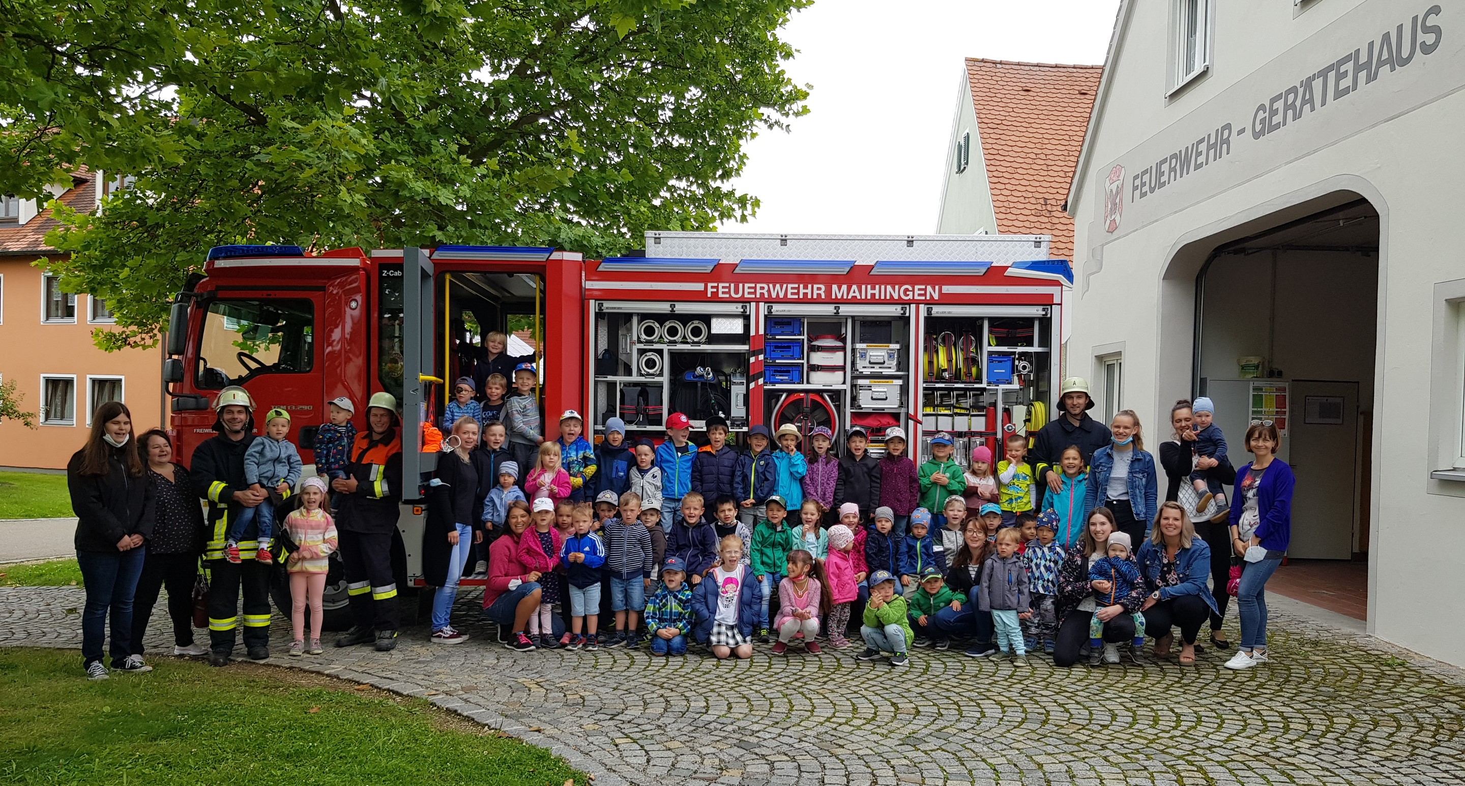 Die Feuerwehr Maihingen hatte Besuch vom örtlichen Kindergarten, denn die Kinder wollten es sich nicht entgehen lassen das neue Löschfahrzeug zu besichtigen. Kommandant Christoph Mayer erklärte den knapp fünfzig anwesenden Kindern und Erzieherinnen die Ausstattung, sowie die Verwendung der einzelnen Geräte im Fahrzeug. Die interessanten Fragen der Kinder konnten größtenteils alle beantwortet werden. Christian Kotz, Leiter der Atemschutzgeräteträger, erläuterte den Kindern den Sinn und das Anlegen eines Atemschutzgerätes. Angezogen in voller Montur konnte er den Kindern vermitteln, dass sie vor ihm keine Angst haben zu brauchen. Als weiteres Highlight baute Maschinist Matthias Baur eine „kleine“ Löschwasserversorgung vom Fahrzeugtank aus auf, wo sich dann die Kinder bei der Wasserabgabe am Strahlrohr beweisen konnten. Als Belohnung für das Interesse wurde anschließend an Alle eine kleine Überraschung ausgegeben. (pm)