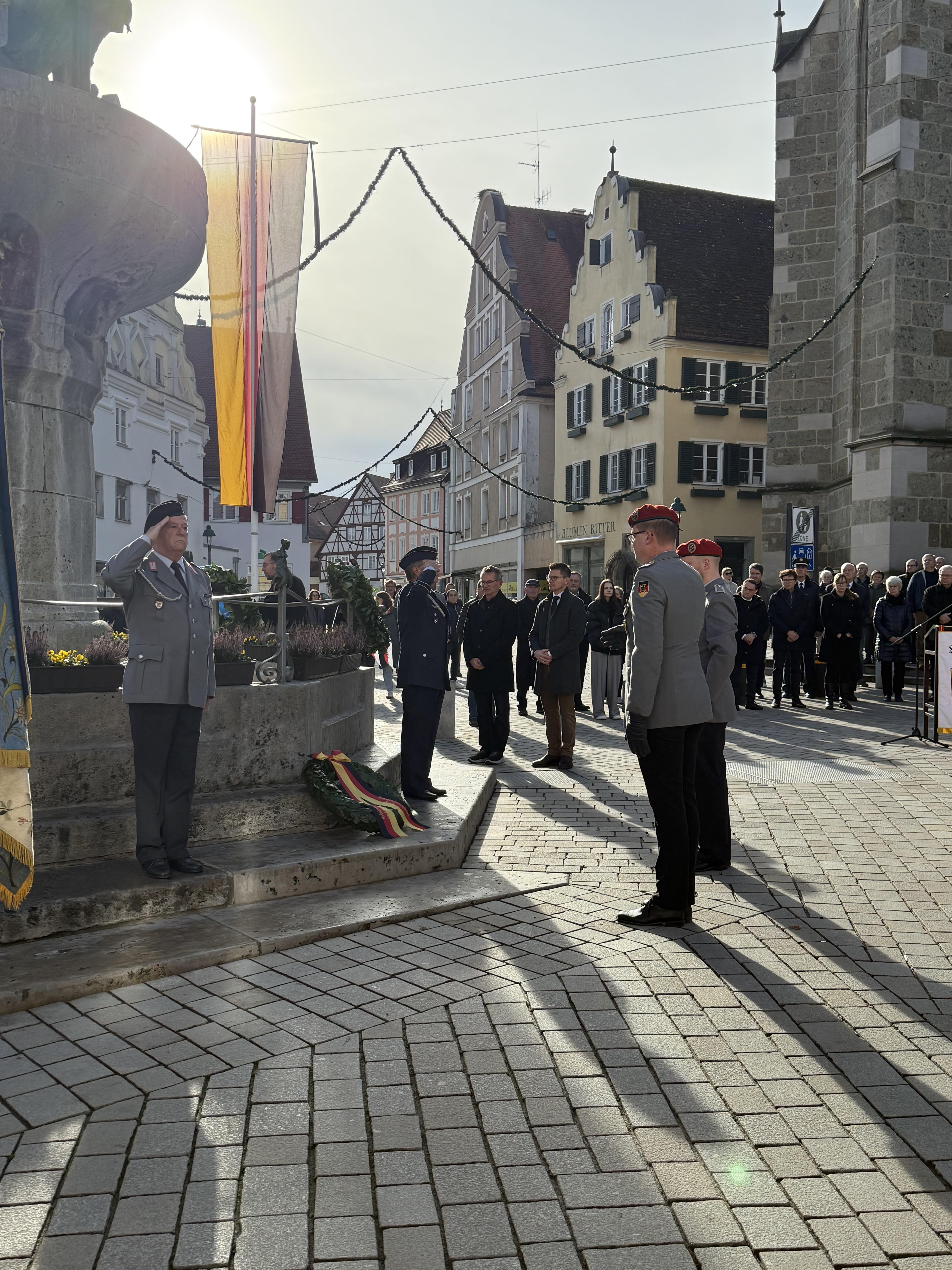 Dekan Wagner und Stadtpfarrer Beck sprachen ein gemeinsames ökumenisches Gebet für die Opfer von Krieg, Terror und Gewalt weltweit – von den Weltkriegen bis zu den aktuellen Konflikten in der Ukraine, im Nahen Osten und an vielen weiteren Orten. Anschließend legten Oberbürgermeister David Wittner, Hermann Häfele für den VdK sowie Vertreter der Reservistenkameradschaft Nördlingen e. V. die traditionellen Kränze nieder. Ein besonderes Zeichen setzten in diesem Jahr zudem Aurelius Gräser, Hannah Böhnle und 3. Bürgermeisterin Gudrun Gebert-Löfflad: Sie legten Papierkraniche am Kriegerbrunnen nieder – ein Symbol der Hoffnung, des Friedens und der internationalen Verständigung. Oberbürgermeister David Wittner dankte allen Beteiligten für ihre Beteiligung an der heutigen Gedenkfeier und erinnerte daran, dass Frieden nicht selbstverständlich sei, sondern jeden Tag neu gestaltet und bewahrt werden müsse. Zum Abschluss spielte die Knabenkapelle die Nationalhymne, bevor der gemeinsame Rückmarsch zum Rathaus erfolgte. (dra)