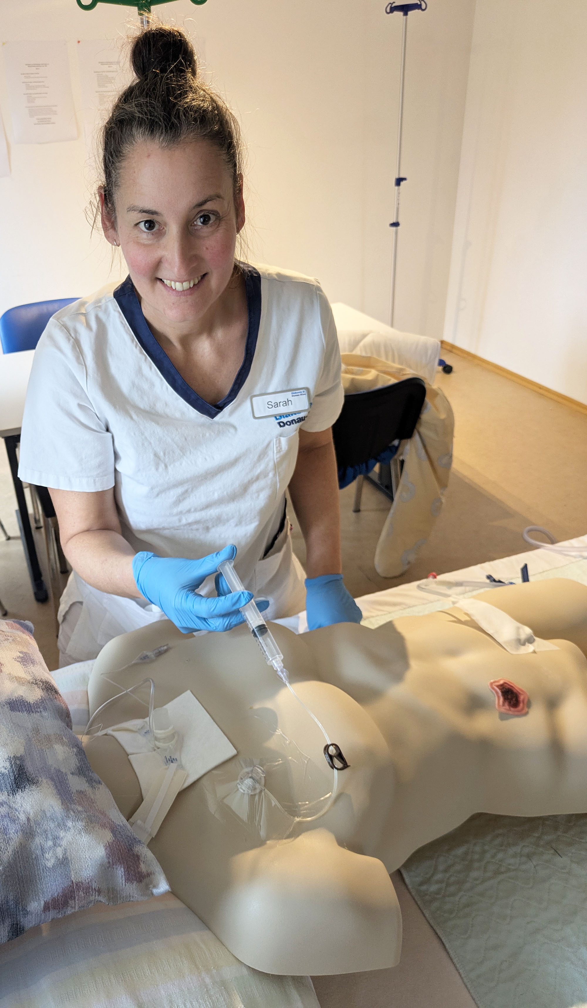 „Viele Ausbildungsinhalte lassen sich am echten Patienten nur eingeschränkt üben“, erklärt Sarah Miesbauer. So sei es kaum möglich, eine Stunde lang Portversorgungen, Infusionen oder steriles Arbeiten zu trainieren, ohne schwerkranke Patienten unnötig zu belasten. Mit „Oskar“ können diese Tätigkeiten in ruhiger Atmosphäre beliebig oft geübt und wiederholt werden. Die umgebaute Puppe verfügt unter anderem über einen Port-Katheter, einen künstlichen Darmausgang (Stoma), einen perkutanen Katheter am Bauch sowie eine Trachealkanüle am Hals. Auch Infusionen oder die Inkontinenzversorgung lassen sich realitätsnah trainieren, berichtet die Pflegefachkraft.