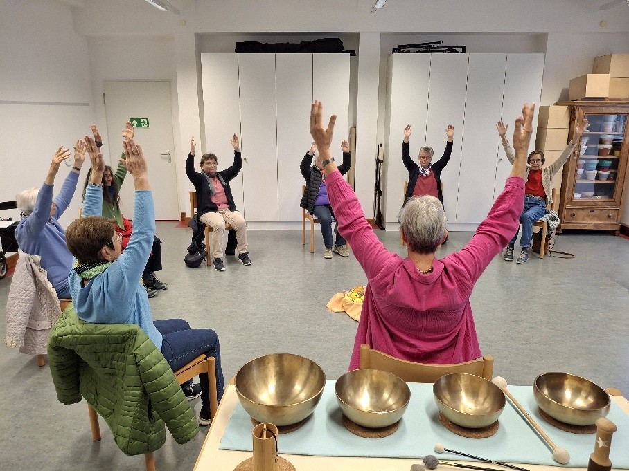 Die Kursleiterin Mechthild Laforet, Lehrerin und erfahrene Klangexpertin für Demenz, begrüßte die elf Teilnehmerinnen zunächst mit sanften Klängen, die sofort eine Atmosphäre der Ruhe und Offenheit schufen. Anschließend gab sie eine kurze Einführung in das Thema Yoga, das – wie sie erklärte – besonders gut dabei helfen kann, zur Ruhe zu kommen und den Alltag für einen Moment loszulassen.