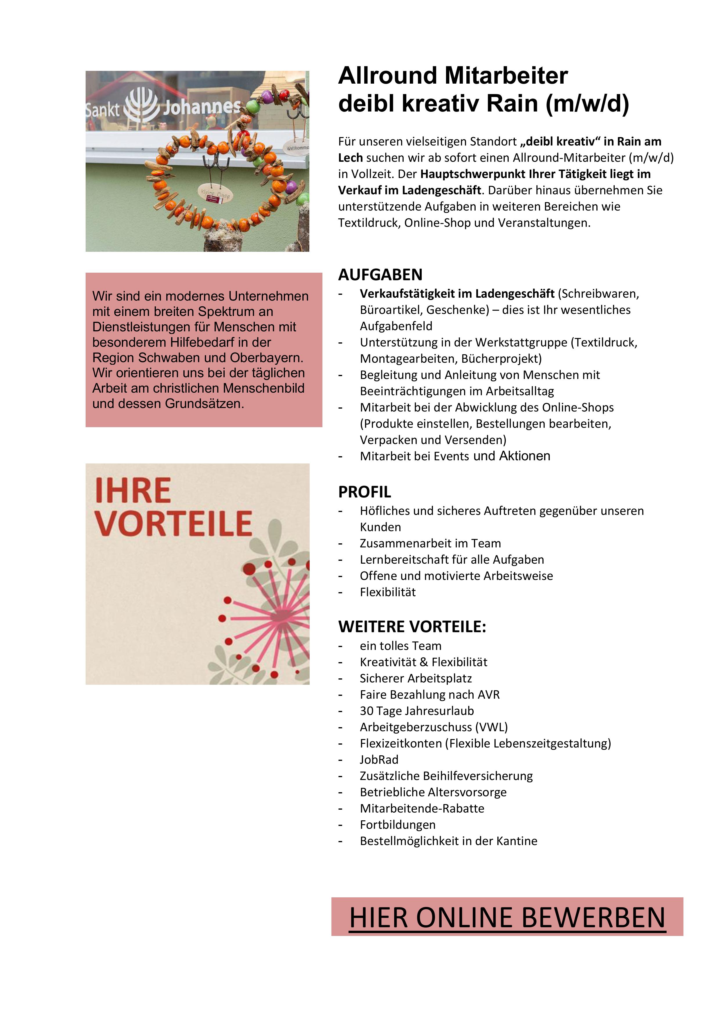 26. November 2025 Top-Job Vollzeit Allround-Mitarbeiter (m/w/d) Sankt Johannes Schloßstraße 8 86688 Marxheim Zur Webseite » Bild: privat Stellenanzeige herunterladen Handwerk