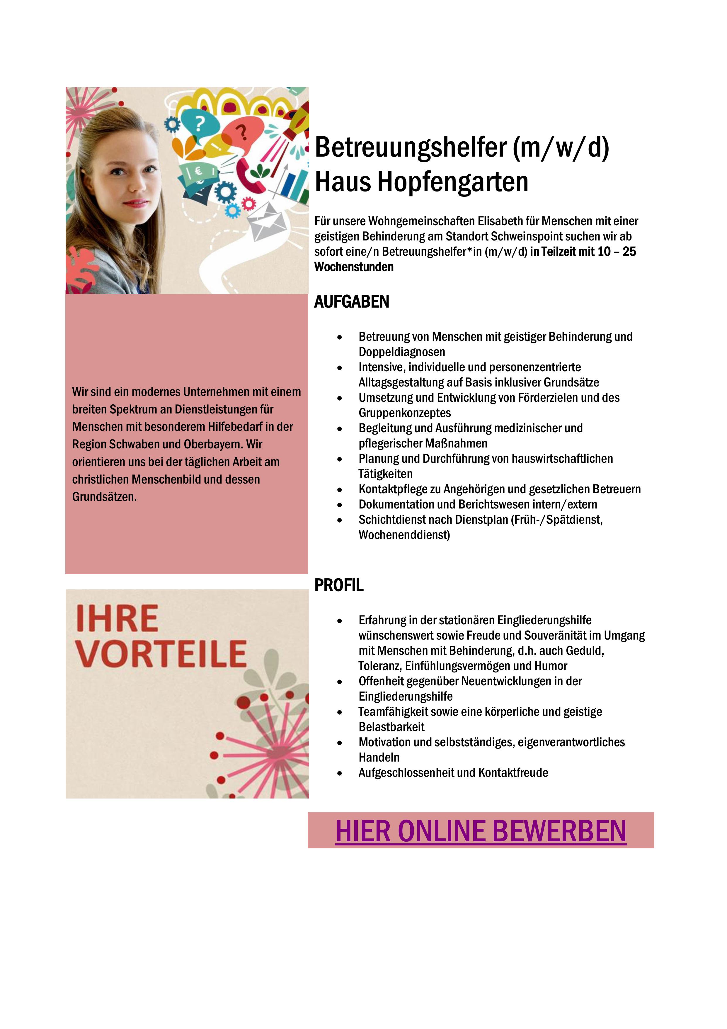 03. März 2026 Top-Job Teilzeit Betreuungshelfer (m/w/d) Sankt Johannes Schloßstraße 8 86688 Marxheim Zur Webseite » Bild: privat Stellenanzeige herunterladen Soziales