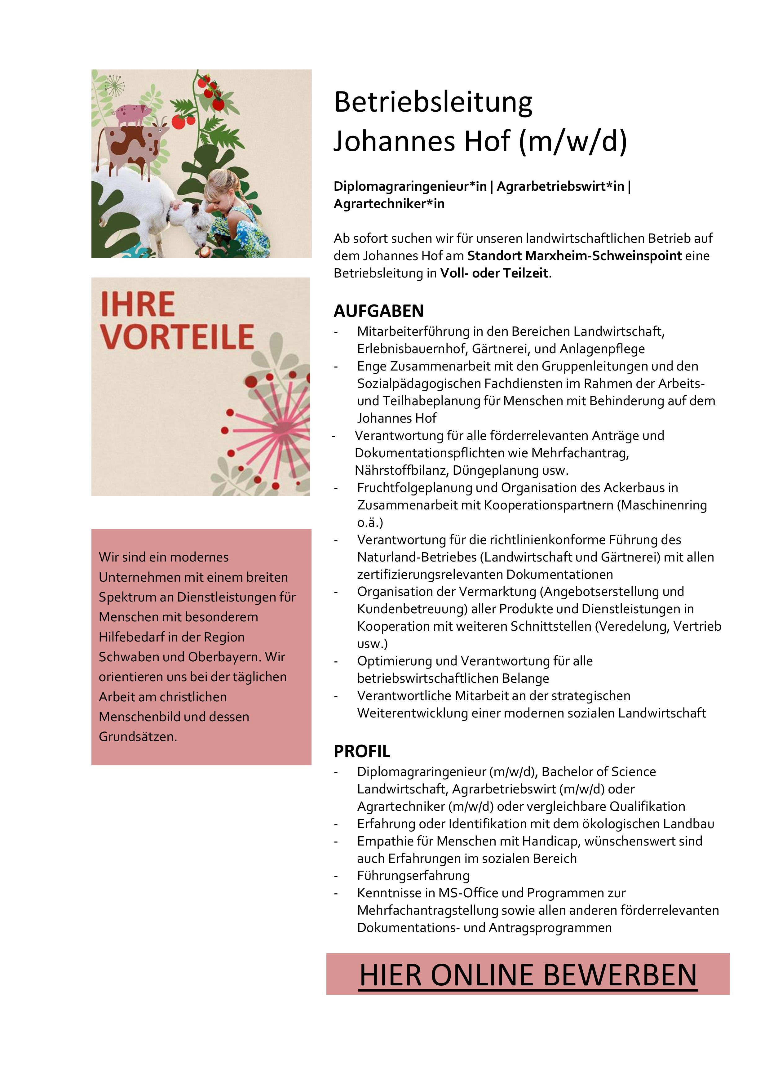 23. April 2026 Top-Job Vollzeit Teilzeit Betriebsleitung Johannes Hof (m/w/d) Sankt Johannes Schloßstraße 8 86688 Marxheim Zur Webseite » Bild: privat Stellenanzeige herunterladen Landwirtschaft