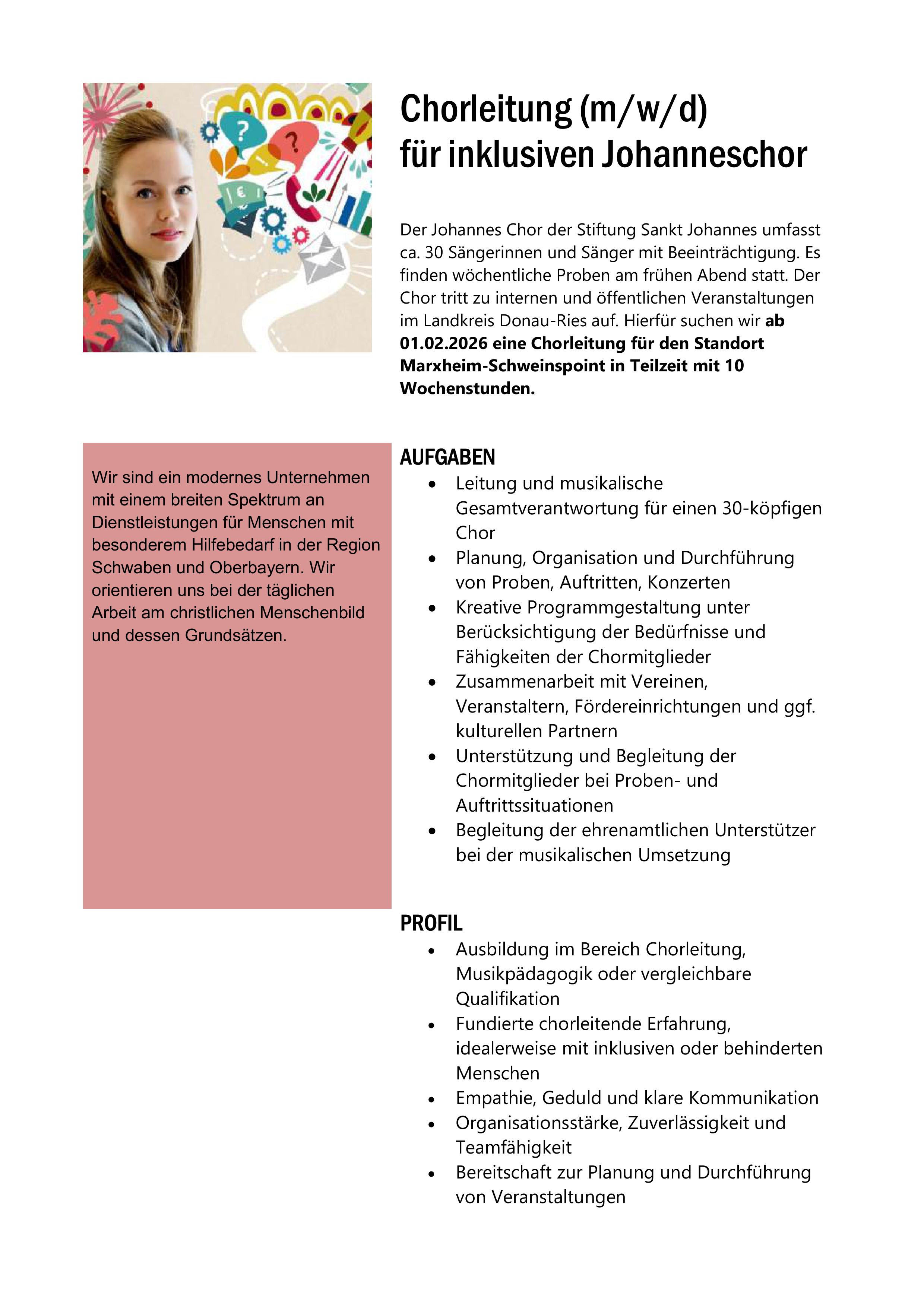 20. Januar 2026 Top-Job Teilzeit Chorleitung (m/w/d) Sankt Johannes Schloßstraße 8 86688 Marxheim Zur Webseite » Bild: privat Stellenanzeige herunterladen Soziales
