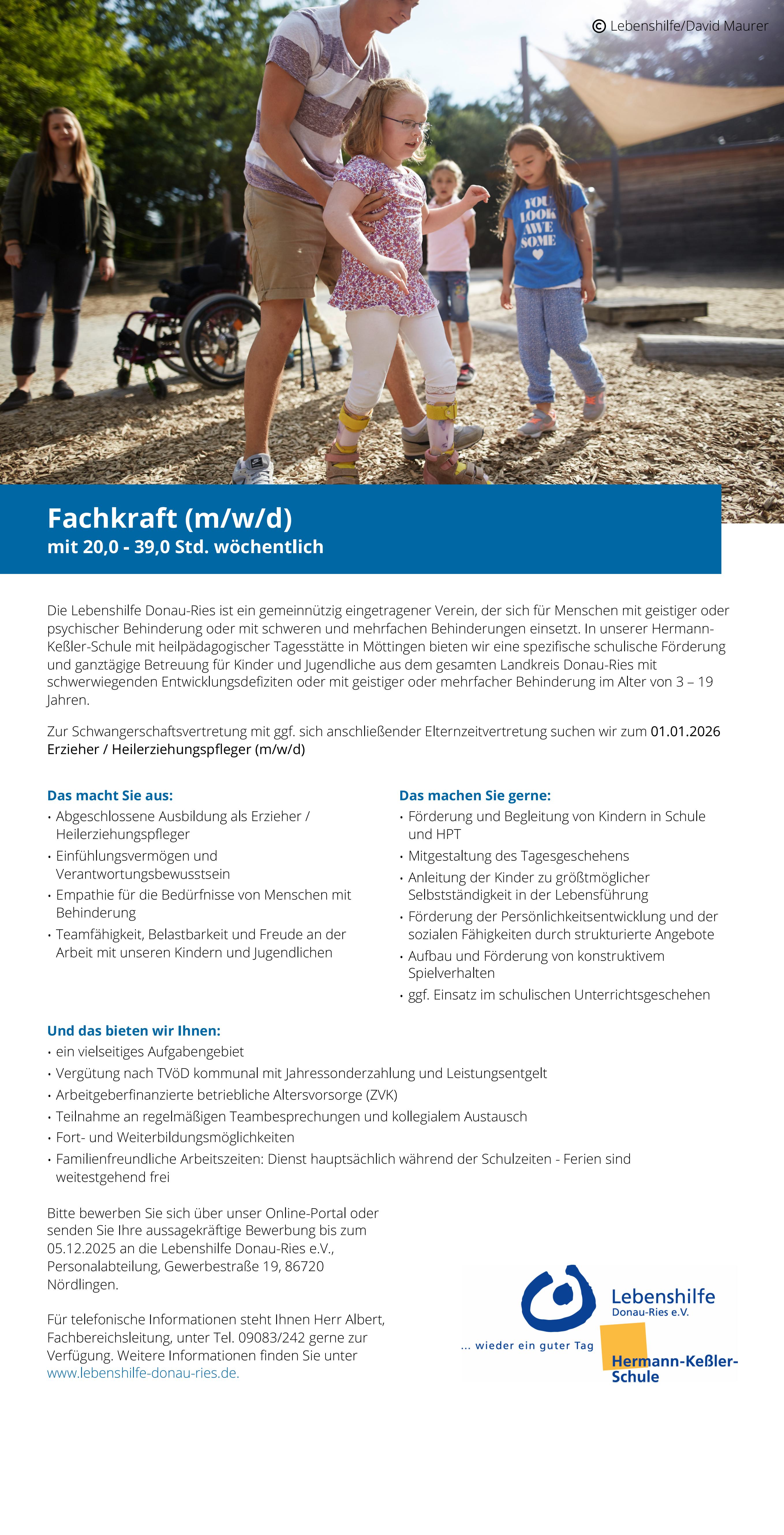 26. November 2025 Top-Job Vollzeit Teilzeit Fachkraft (m/w/d) Lebenshilfe Donau-Ries e.V. / Hermann-Keßler-Schule Personalabteilung Gewerbestraße 19 86720 Nördlingen Online bewerben » Bild: privat Stellenanzeige herunterladen Erziehung