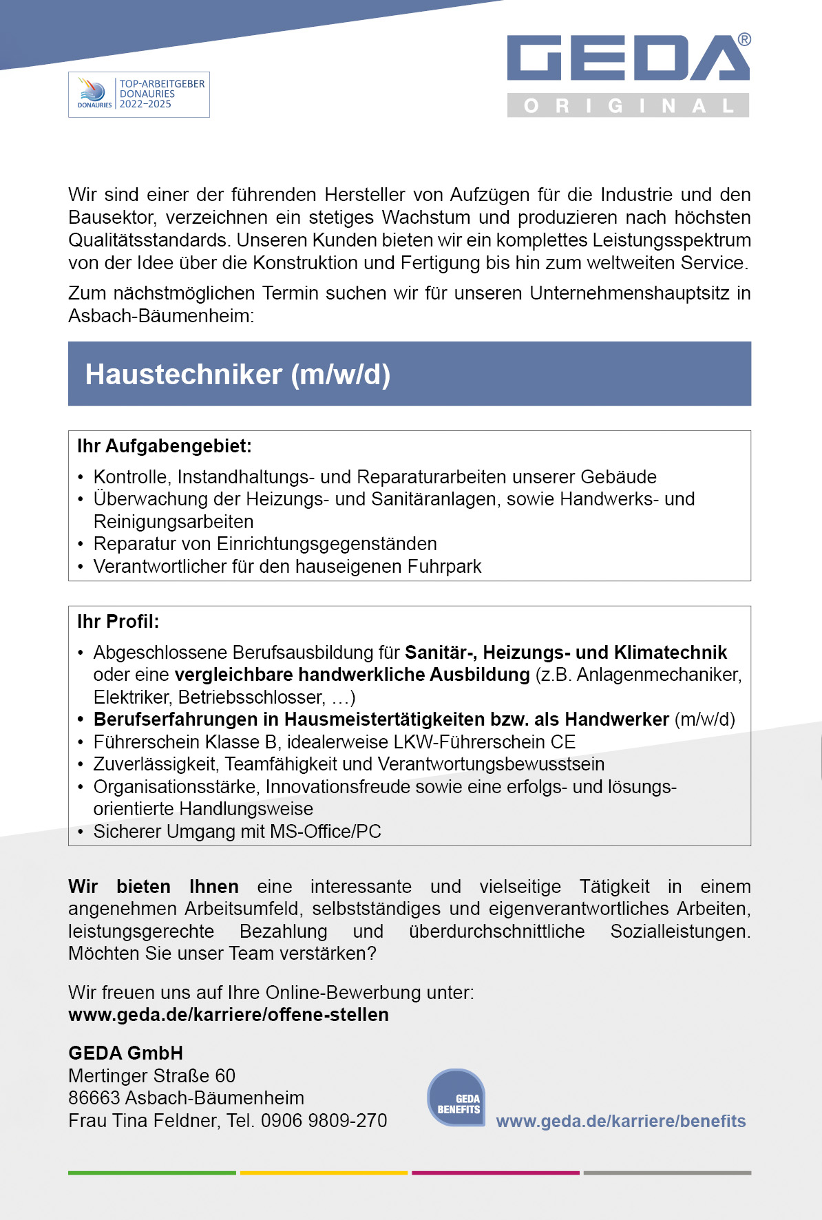 01. November 2025 Top-Job Haustechniker (m/w/d) GEDA GmbH Mertinger Straße 60 86663 Asbach-Bäumenheim Zur Webseite » Online bewerben » Bild: privat Stellenanzeige herunterladen Handwerk