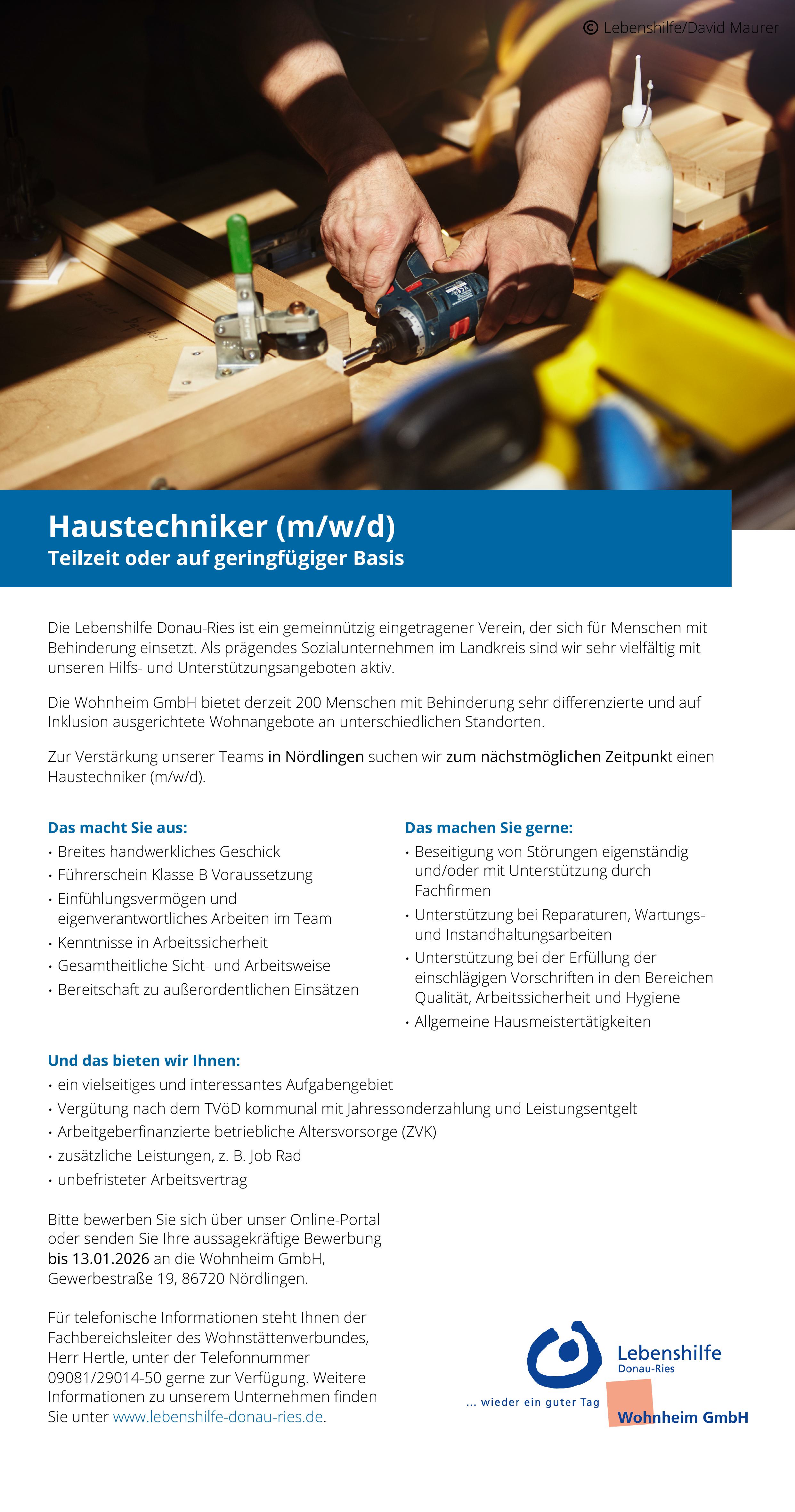 19. Dezember 2025 Top-Job Teilzeit Lebenshilfe Donau-Ries Wohnheim GmbH Haustechniker (m/w/d) Lebenshilfe Donau-Ries e.V. / Wohnheim GmbH Personalverwaltung Gewerbestraße 19 86720 Nördlingen Zur Webseite » Online bewerben » Bild: privat Stellenanzeige herunterladen Dienstleistung