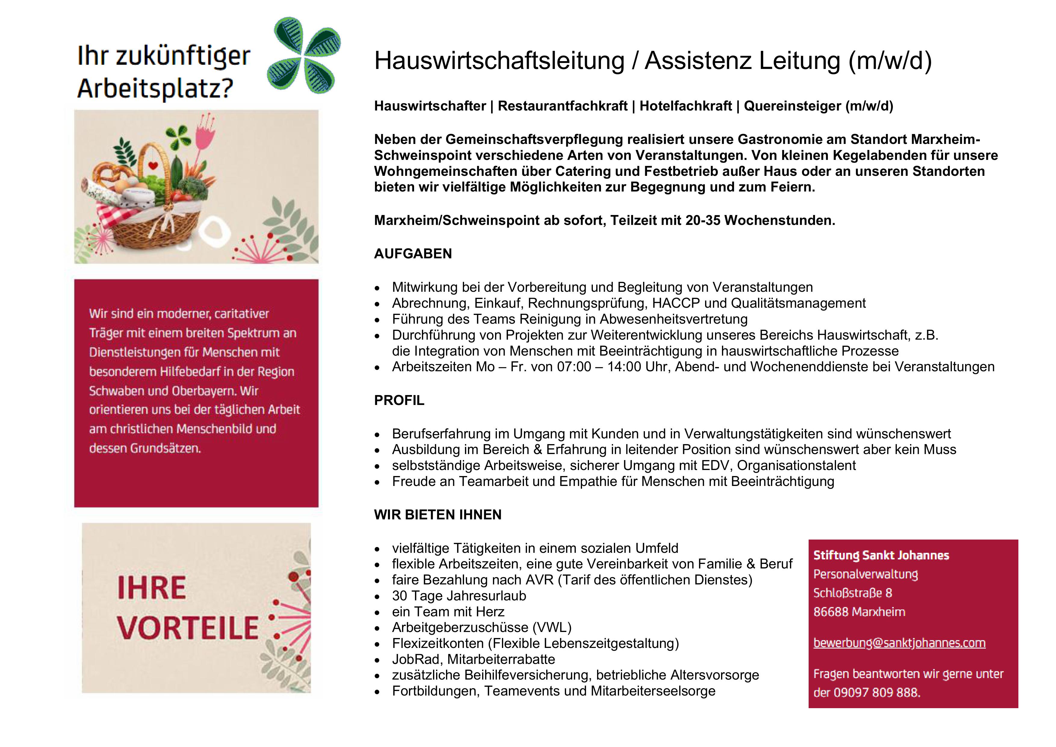 23. Oktober 2025 Top-Job Teilzeit Hauswirtschaftsleitung / Assistenz Leitung (m/w/d) Sankt Johannes Schloßstraße 8 86688 Marxheim Zur Webseite » Bild: privat Stellenanzeige herunterladen Gastronomie Hauswirtschaft
