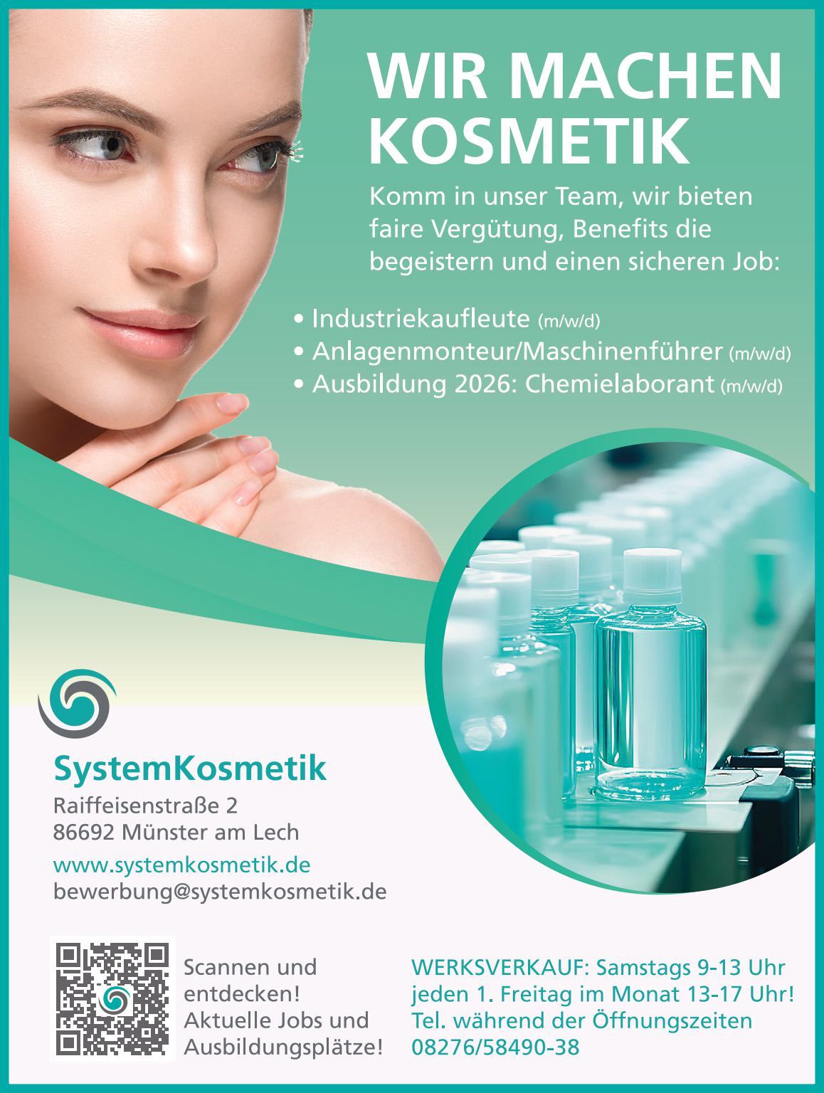 28. April 2026 Vollzeit Ausbildung Industriekaufleute; Anlagenmonteur/Maschinenführer; Ausbildung Chemielaborant (m/w/d) SystemKosmetik GmbH Raiffeisenstr. 2 86692 Münster am Lech Bild: privat Stellenanzeige herunterladen Industrie