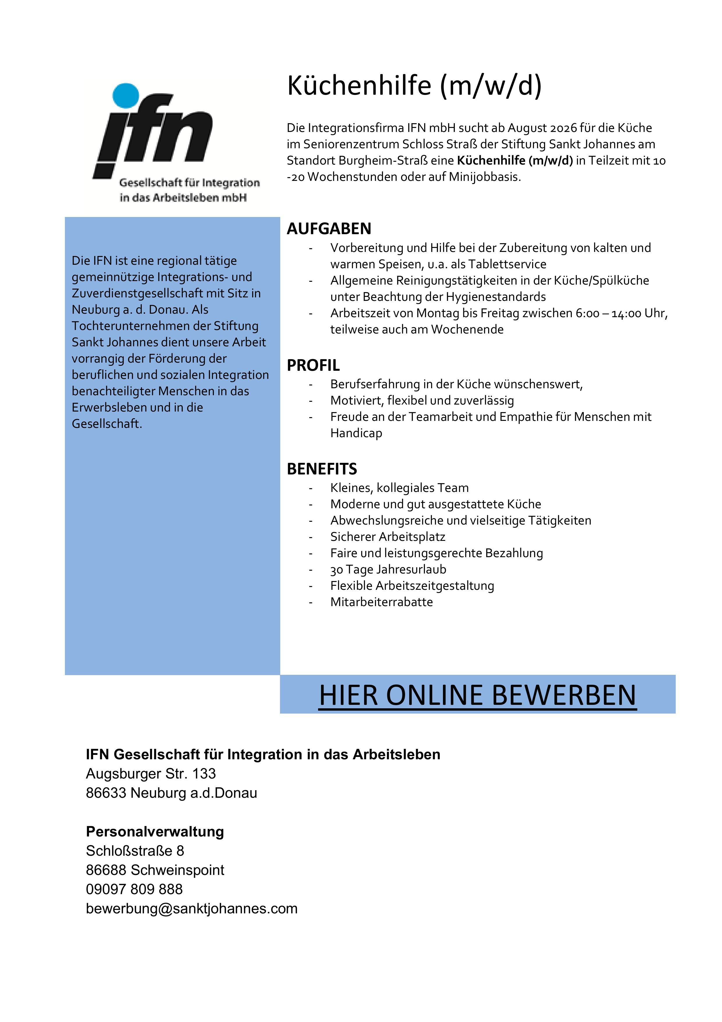 23. April 2026 Top-Job Teilzeit Küchenhilfe (m/w/d) Sankt Johannes Schloßstraße 8 86688 Marxheim Zur Webseite » Bild: privat Stellenanzeige herunterladen Hauswirtschaft