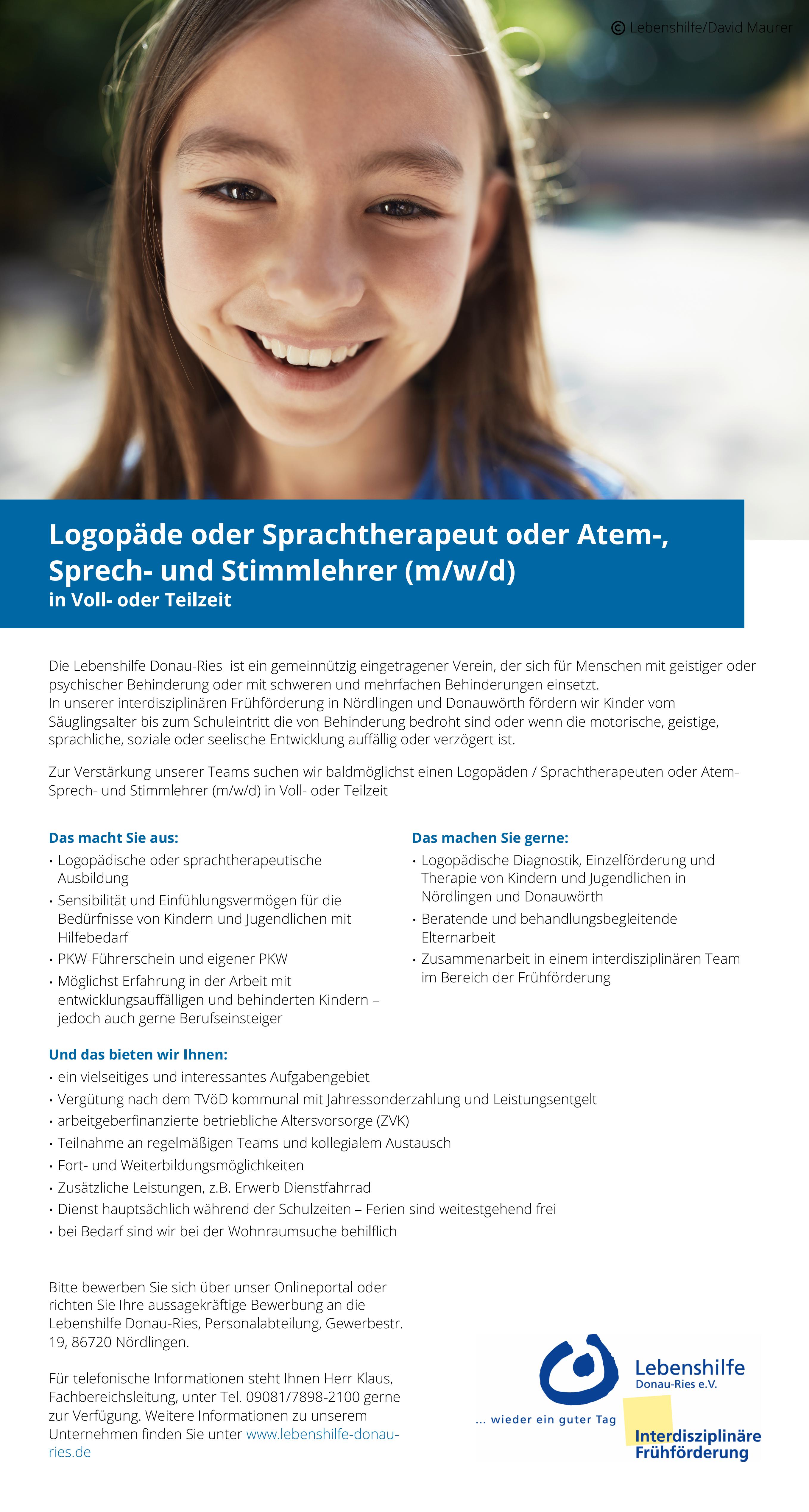 09. Februar 2026 Top-Job Vollzeit Teilzeit Logopäde oder Sprachtherapeut oder Atem-,Sprech- und Stimmlehrer (m/w/d) Lebenshilfe Donau-Ries e.V. / Interdisziplinäre Frühförderung Gewerbestraße 19 86720 Nördlingen Online bewerben » Bild: privat Stellenanzeige herunterladen Gesundheit Soziales