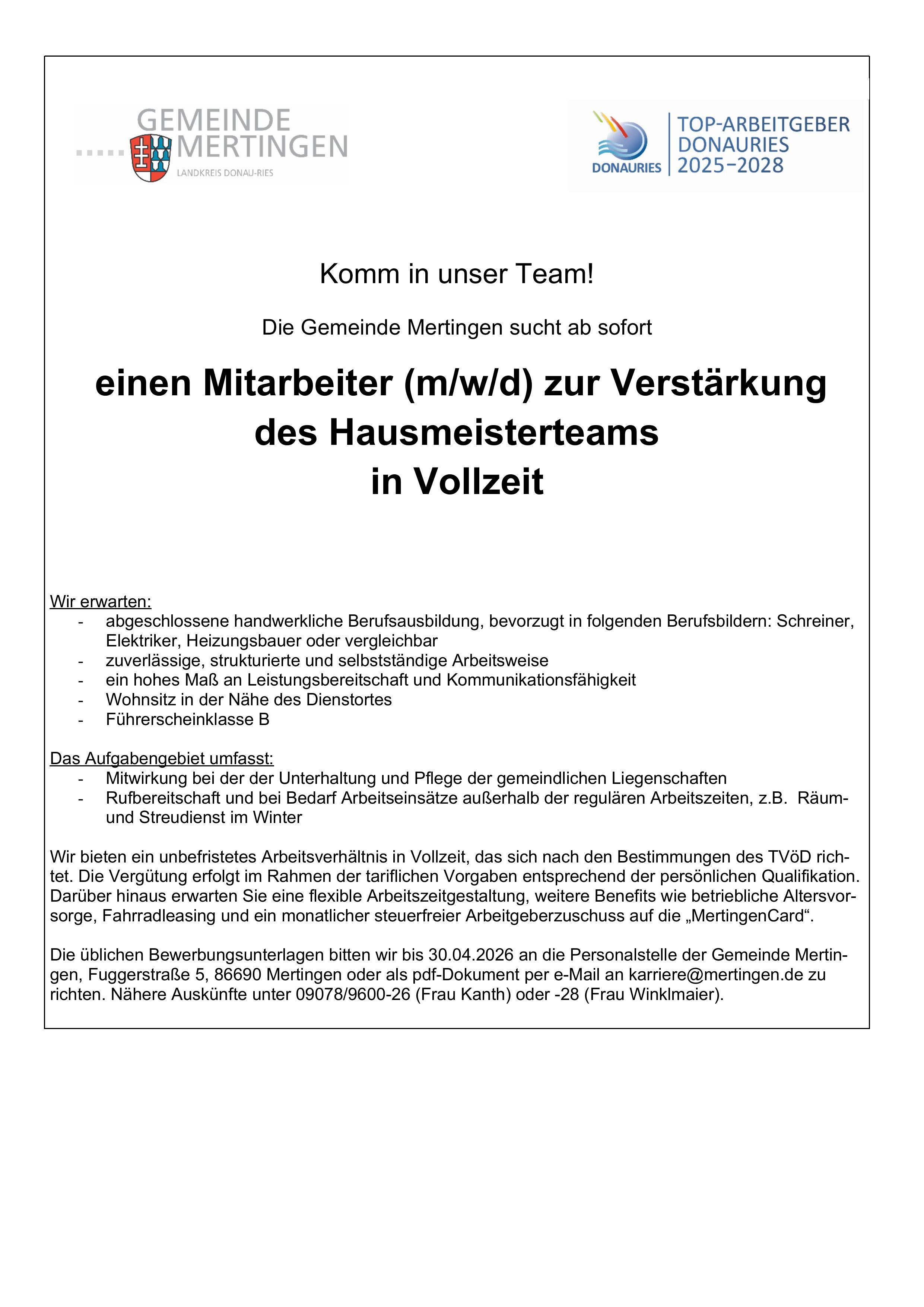 19. März 2026 Vollzeit Mitarbeiter (m/w/d) zur Verstärkung des Hausmeisterteams Gemeinde Mertingen Fuggerstraße 5 86690 Mertingen Zur Webseite » Bild: privat Stellenanzeige herunterladen Handwerk