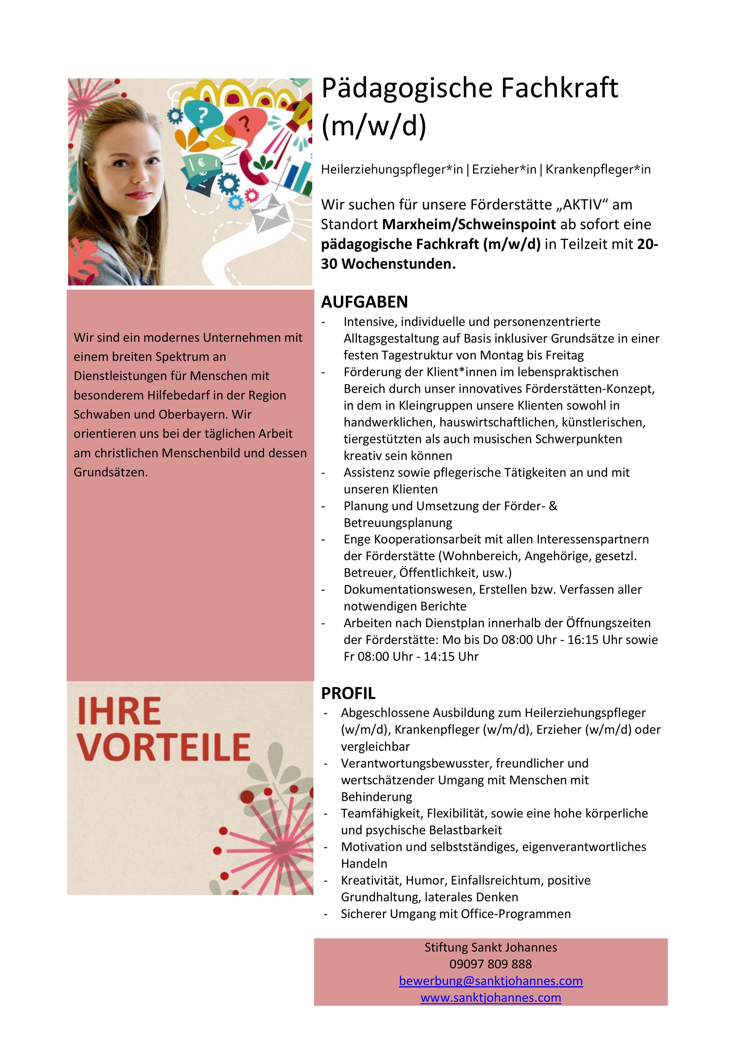 05. November 2025 Top-Job Teilzeit Pädagogische Fachkraft (m/w/d) Sankt Johannes Schloßstraße 8 86688 Marxheim Zur Webseite » Bild: privat Stellenanzeige herunterladen Erziehung Gesundheit Pflege Soziales