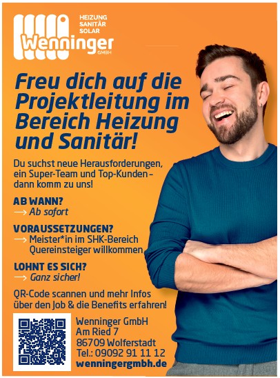 28. April 2026 Vollzeit Projektleitung SHK (m/w/d) Wenninger GmbH Am Ried 7 86708 Wolferstadt E-Mail: info@wenningergmbh.de Zur Webseite » Online bewerben » Bild: privat Stellenanzeige herunterladen Handwerk