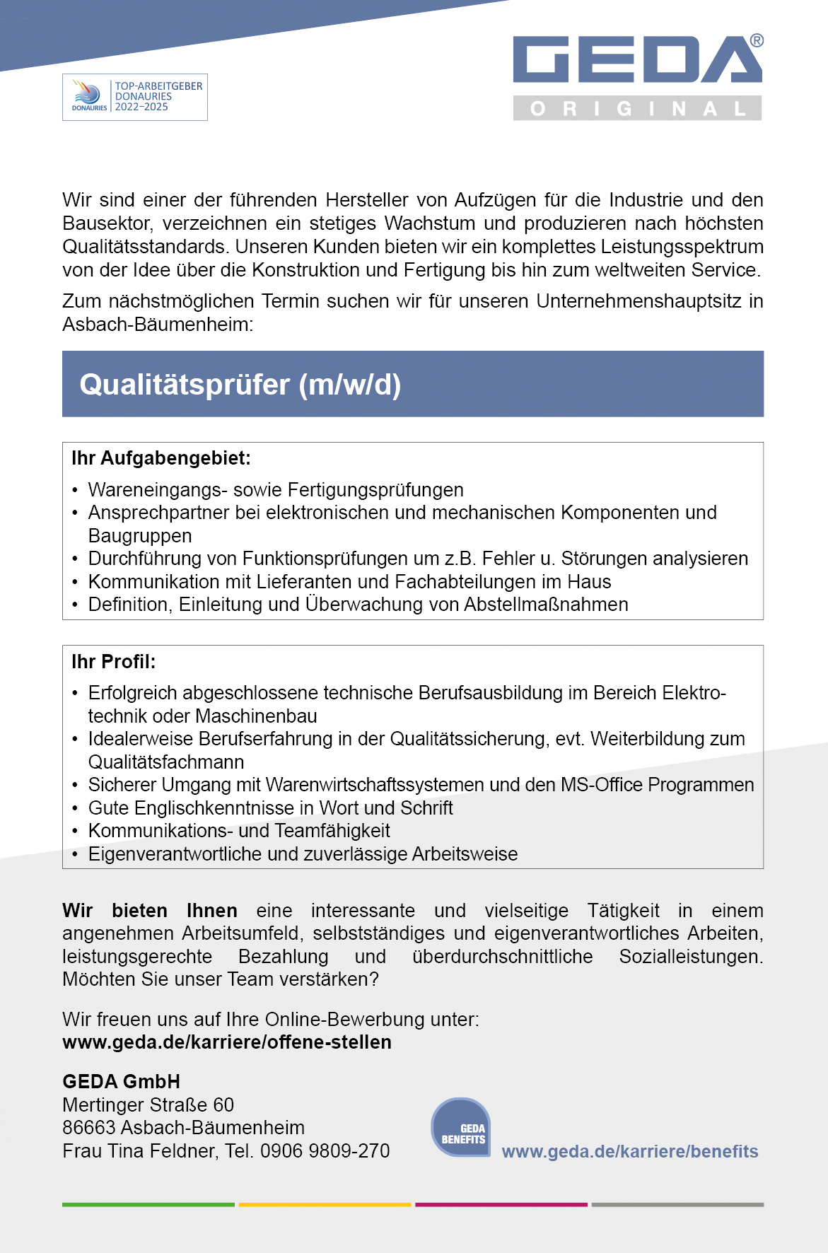 01. November 2025 Top-Job Qualitätsprüfer (m/w/d) GEDA GmbH Mertinger Straße 60 86663 Asbach-Bäumenheim Zur Webseite » Online bewerben » Bild: privat Stellenanzeige herunterladen Technik