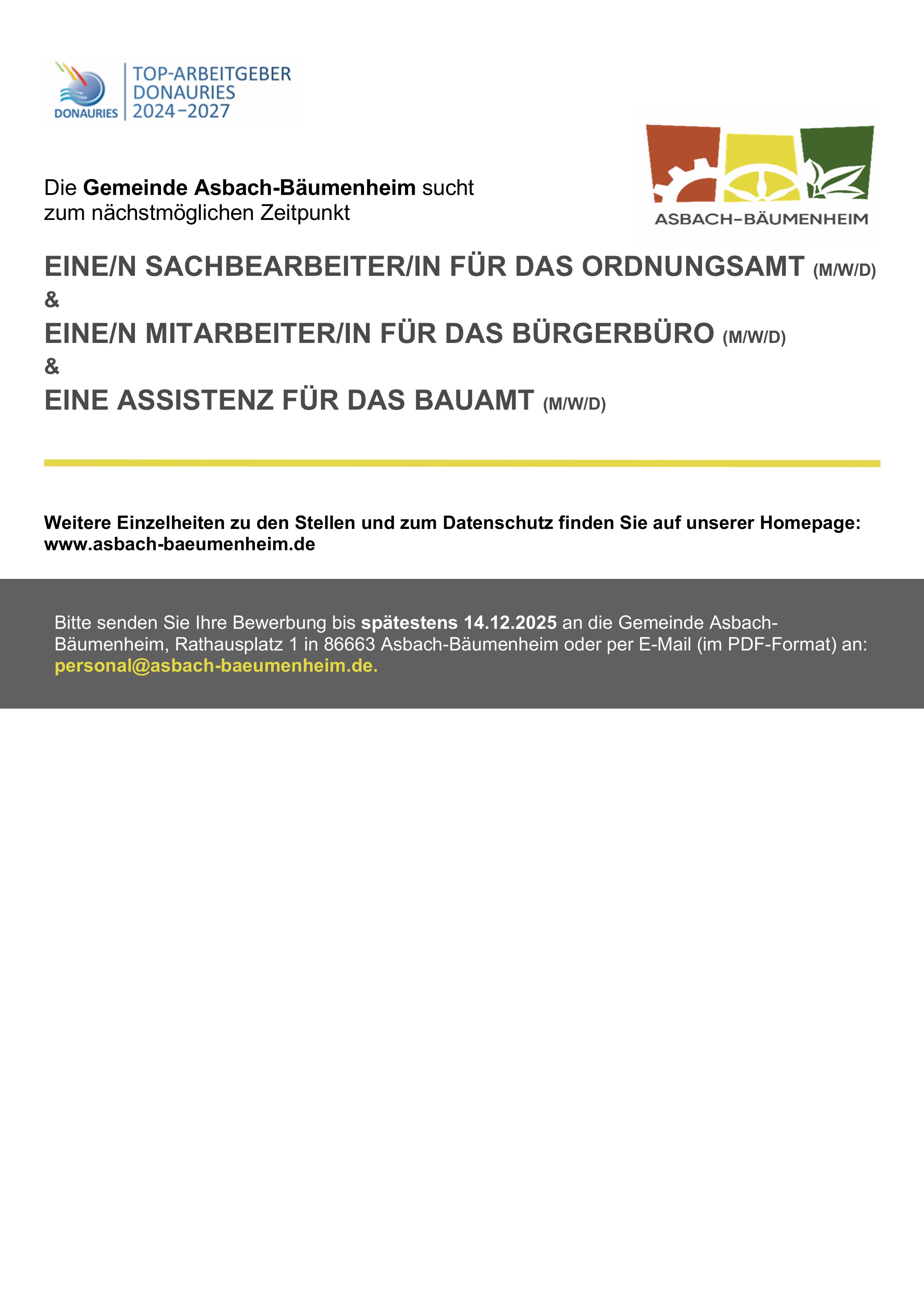 Sachbearbeiter/in für das Ordnungsamt (m/w/d), Mitarbeiter/in für das Bürgerbüro (m/w/d) und Assistenz für das Bauamt (m/w/d)